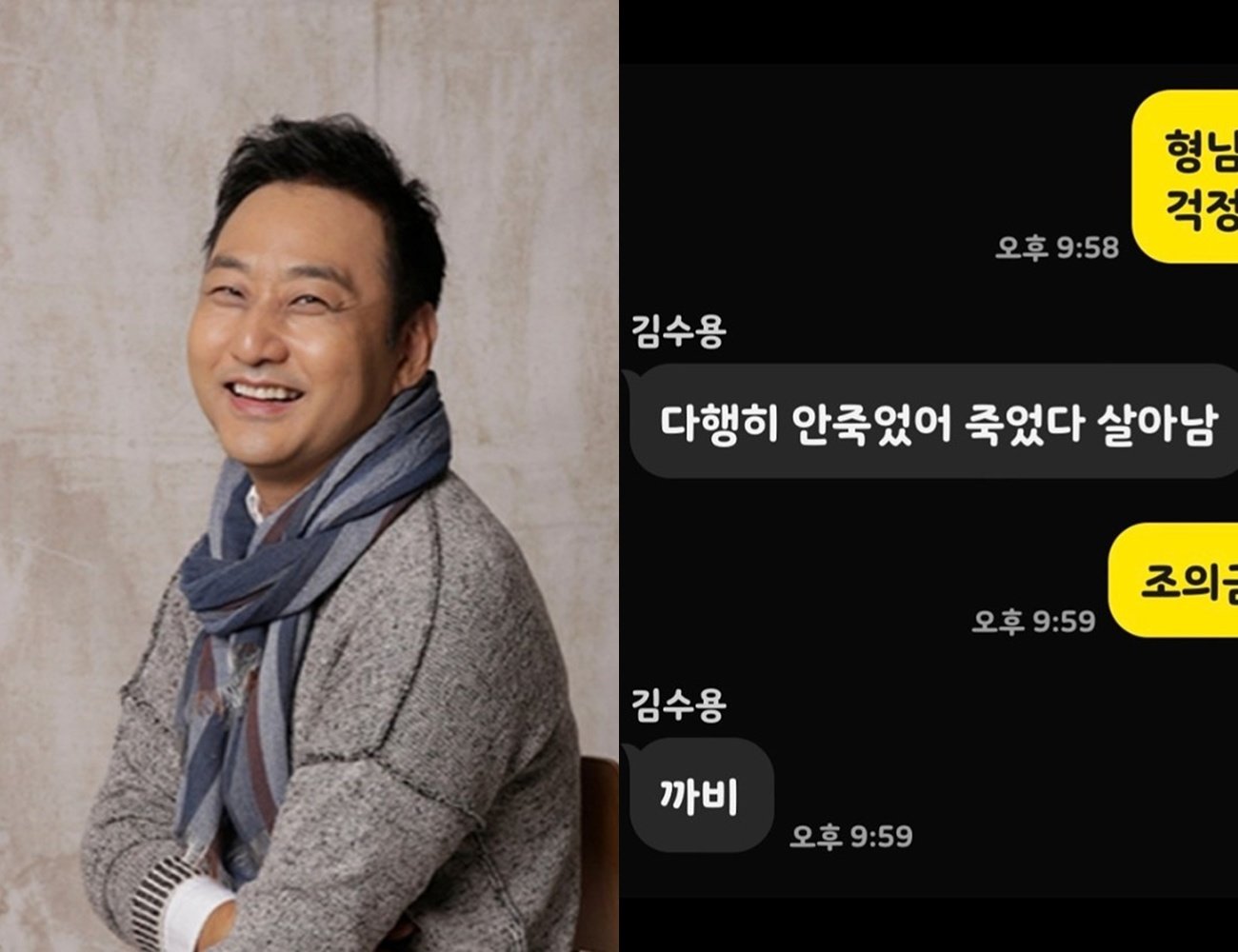 공개된 메시지 속 윤석주는 “형님 괜찮으시냐. 걱정된다”고 안부를 물었다. 김수용은 “다행히 안 죽었다. 죽었다 살아났다”고 너스레를 떨었다.