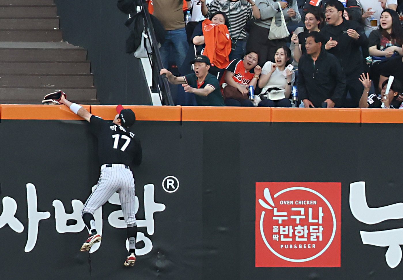30일 대전 한화생명볼파크에서 열린 ‘2025 신한 SOL 뱅크 KBO리그’ 프로야구 한화 이글스와 LG 트윈스 경기에서 한화 2회말 무사 1루에서 한화 채은성의 홈런성 타구를 LG 박해민이 담장 위에서 잡아내고 있다. 2025.4.30/뉴스1