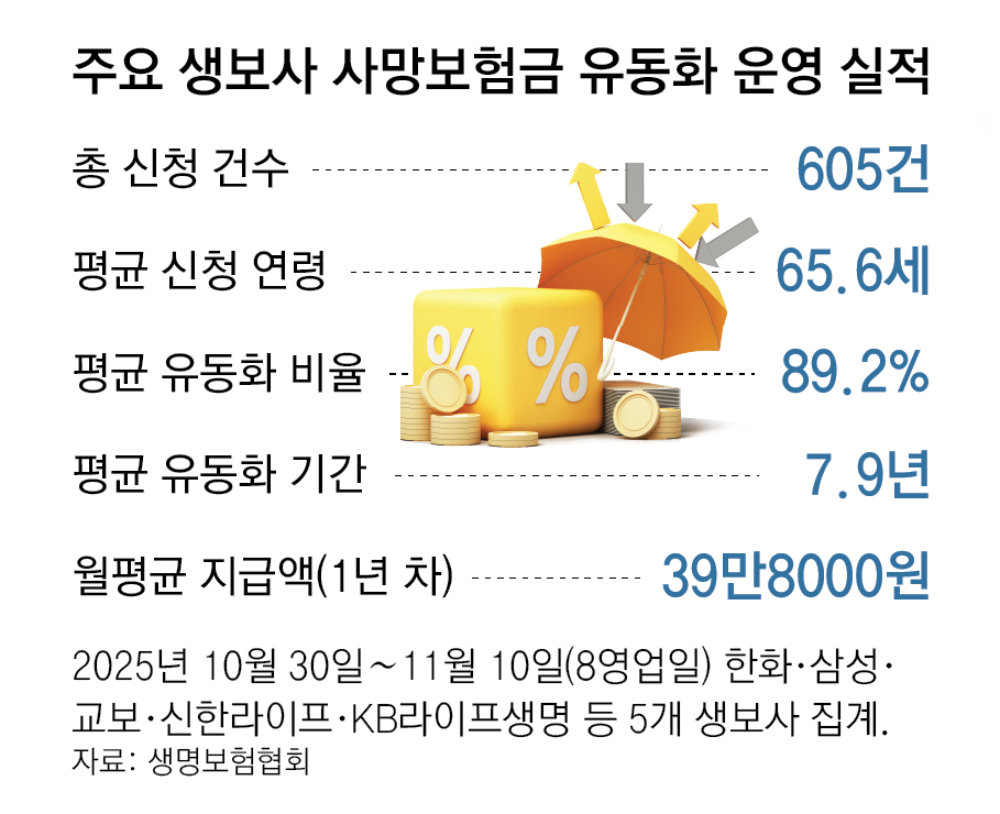 사망보험금 유동화는 금융위원회가 올 3월 저소득층의 노후 준비를 돕기 위해 마련한 제도다. 현재 5개사가 운영 중이며 내년 1월부터 나머지 17곳 회사로 확대된다. 이에 대해 이재명 대통령은 올 6월 국무회의에서 “좋은 제도를 잘 만드셨는데 문제는 (이 제도를) 모르는 국민들이 많은 것 같다. 저도 잘 모르고 있었다”고 칭찬하기도 했다.