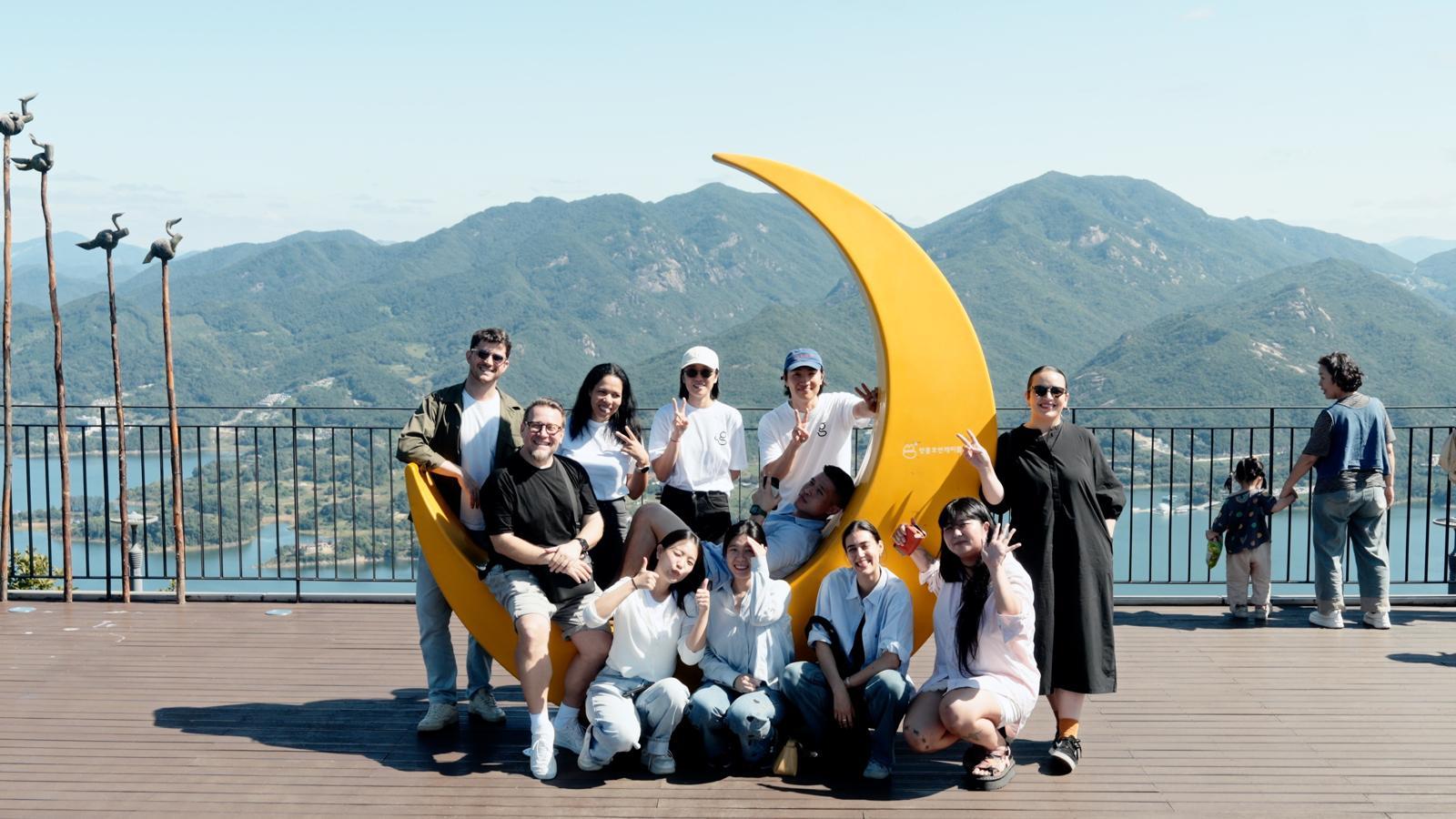 스타트업 ‘굿메이트트래블’의 지역 여행 프로그램에 참여한 외국인 관광객들이 충북 제천 청풍호를 배경으로 남긴 기념사진. 한국관광공사 제공