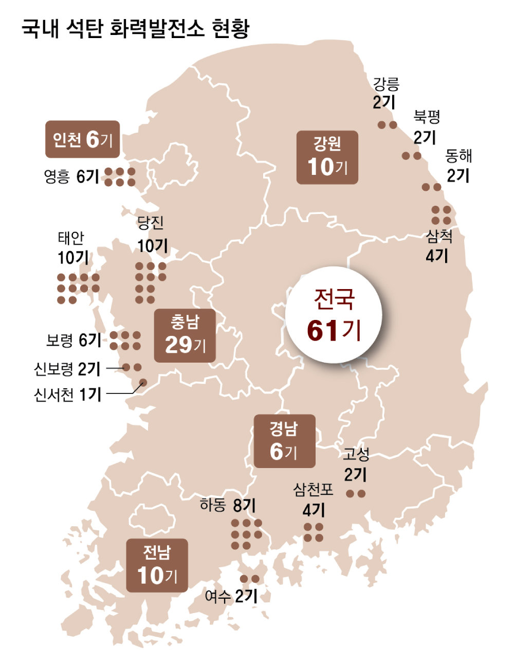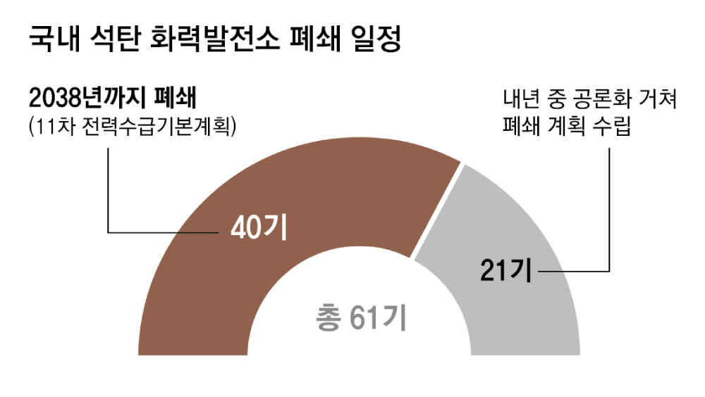 정부는 현재 운영 중인 석탄 화력발전소 61기 중 40기를 11차 전력수급기본계획에 따라 2038년까지 폐쇄하고 나머지 21기에 대해서는 내년 중 구체적인 폐쇄 계획을 내놓겠다고 밝혔다.