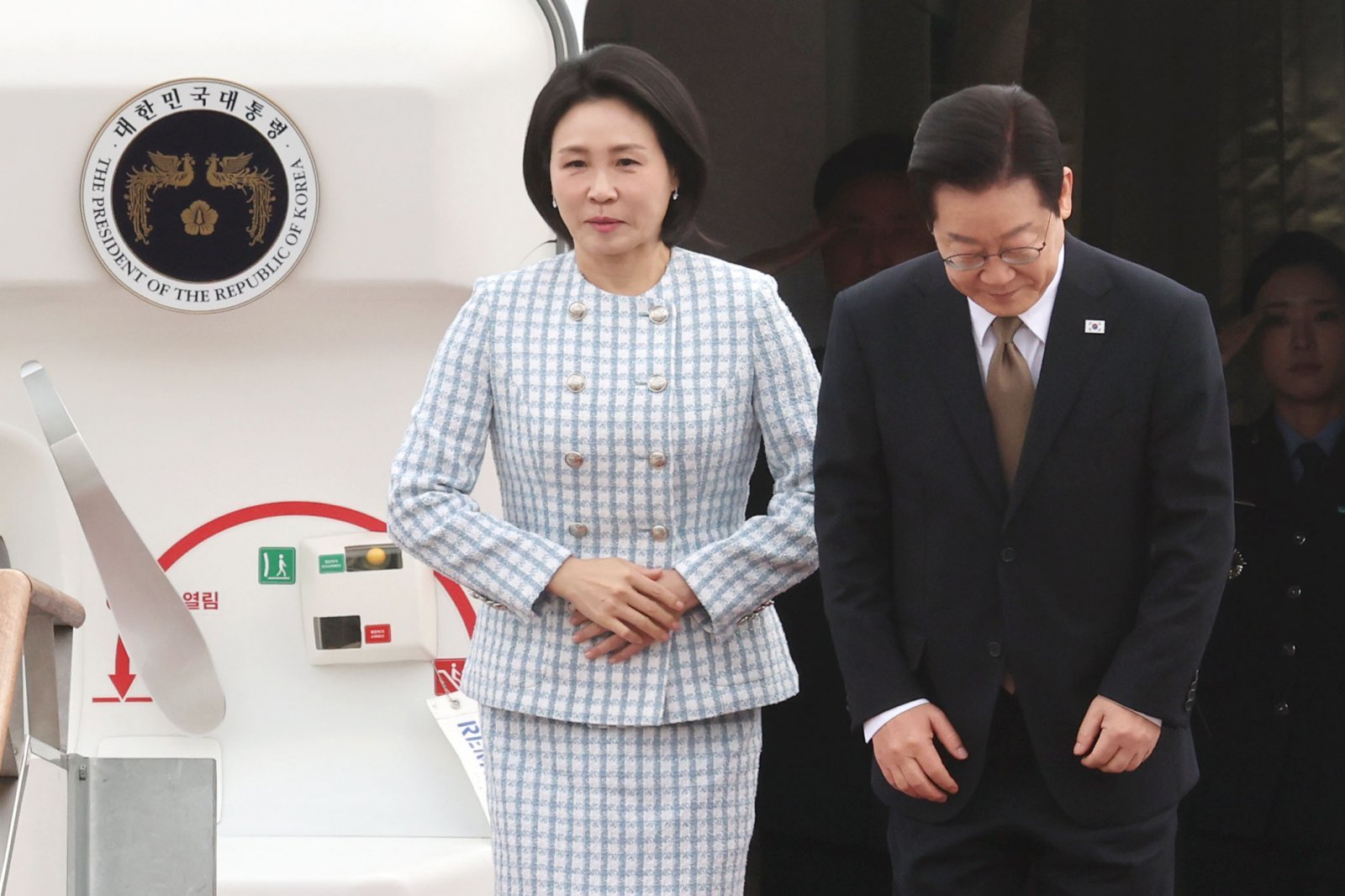 이재명 대통령과 김혜경 여사가 17일 오전 주요 20개국(G20) 정상회의 참석을 계기로 아프리카와 중동 등 4개국 순방을 위해 경기 성남 서울공항을 통해 출국하며 인사하고 있다. 2025.11.17/뉴스1