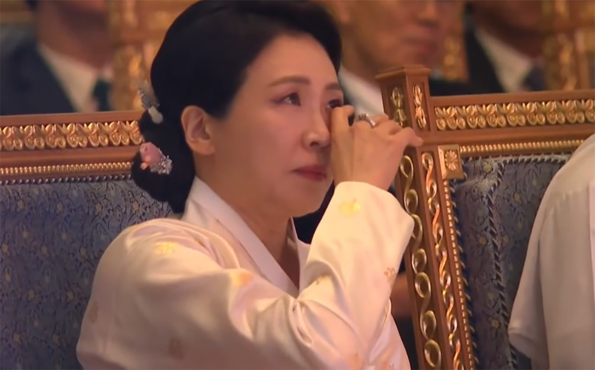 KBS 유튜브 영상 캡처조 씨가 분단의 아픔을 담은 가곡 ‘그리운 금강산’을 부르자 이 대통령은 눈을 감고 노래에 귀를 기울였다. 무대에 몰입해 있던 김 여사는 곡이 절정에 달하자 결국 눈물을 쏟아냈다. 흐르는 눈물을 연신 손으로 닦아내는 김 여사에게 옆자리에 있던 현지 인사가 휴지를 건네는 모습도 포착됐다. 조 씨의 공연이 끝나자 김 여사는 큰 박수와 함께 환호를 보냈다.