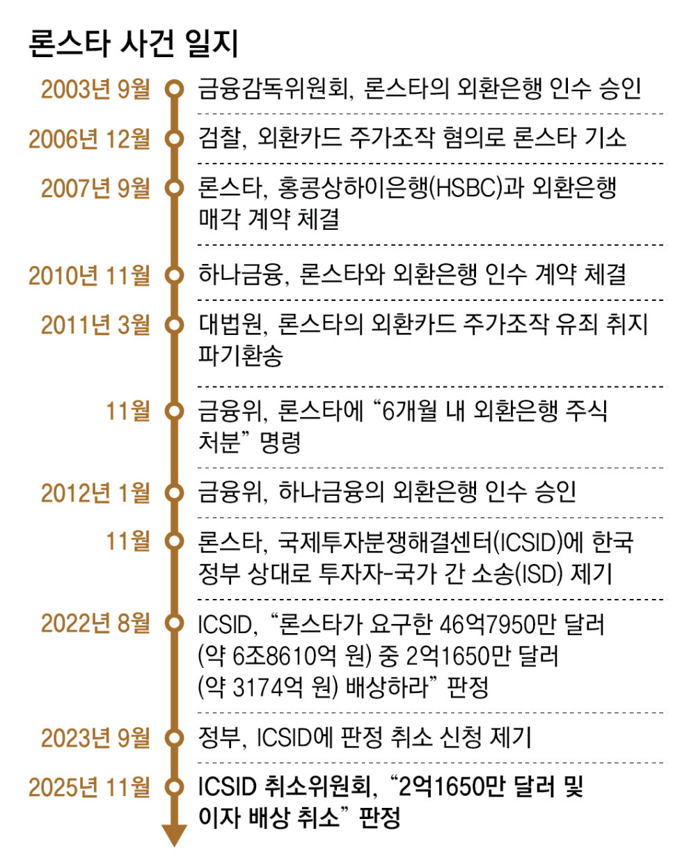 정홍식 법무부 국제법무국장은 19일 브리핑을 열고 론스타가 2012년 정부를 상대로 제기한 약 46억8000만 달러(약 6조9000억 원) 규모의 손해배상과 관련한 취소 절차에서 정부가 최종 승소했다고 밝혔다. 정부가 최종 승소하면서 론스타에 배상해야 했던 4000억 원도 전부 소멸됐다.