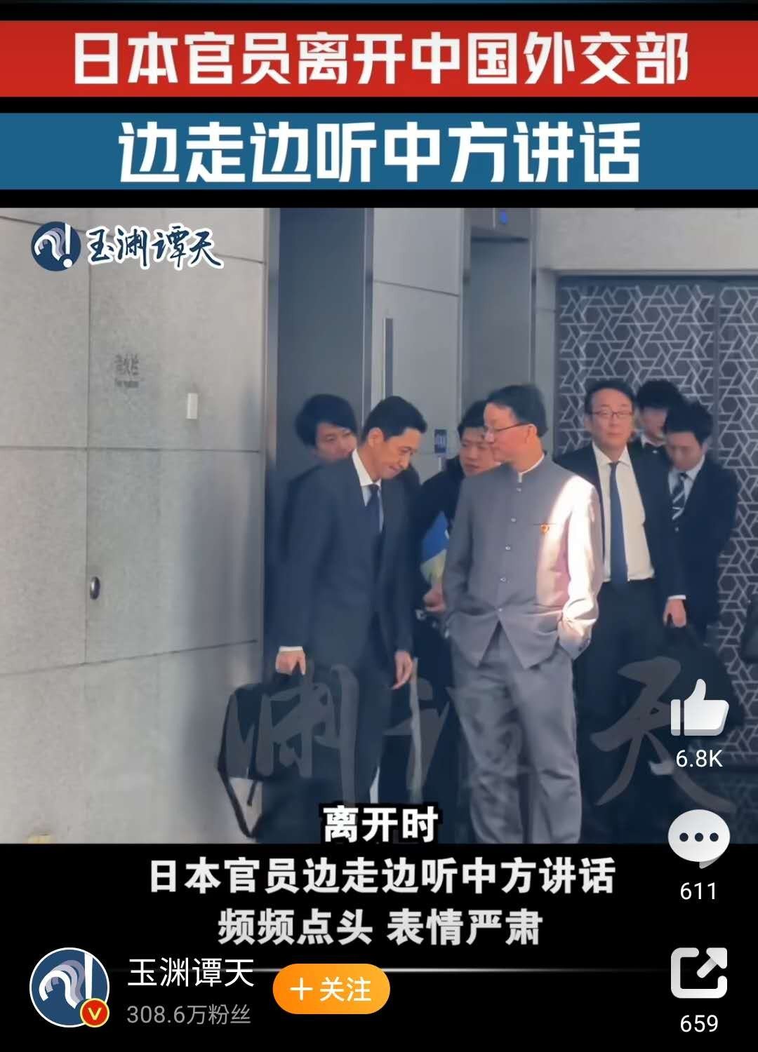 영상에는 류진쑹 외교부 아주사장(아시아국장)이 바지 주머니에 손을 넣은 채 잠시 가나이 마사아키 일본 외무성 아시아대양주국장을 내려다보며 말을 건네고 이어 걸음을 옮기는 장면이 담겼다. 반면 가나이 국장은 고개를 약간 숙인 채 난처한 표정으로 류 사장의 말을 듣다가 차량에 올라 떠나는 모습이 포착됐다.
