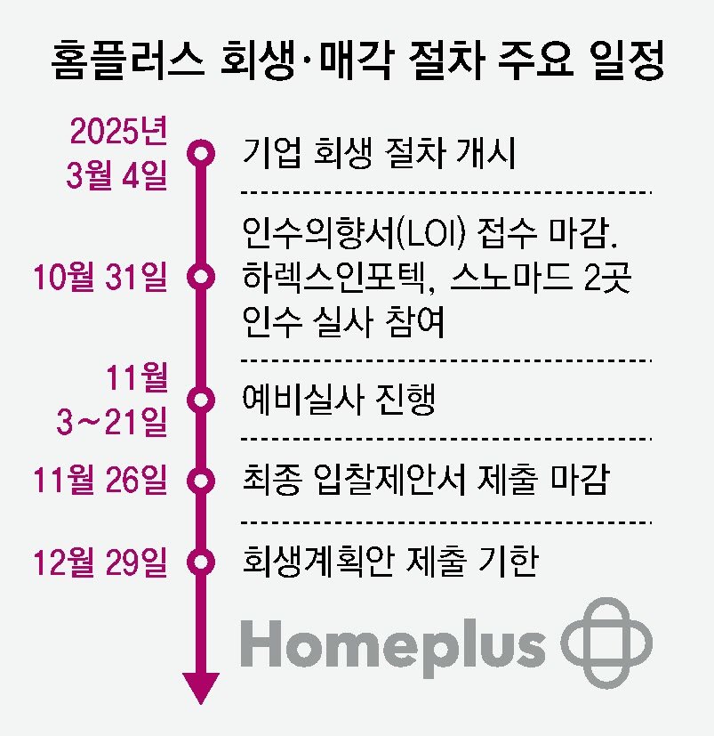 19일 유통업계에 따르면 지난달 31일 마감된 홈플러스 매각 공개입찰에는 인공지능(AI) 핀테크 기업 ‘하렉스인포텍’과 부동산 임대·개발 업체 ‘스노마드’ 두 곳이 인수의향서를 제출했다. 이들은 21일까지 예비실사를 진행한 뒤 26일 오후 3시까지 최종 입찰제안서 제출 여부를 결정할 예정이다.