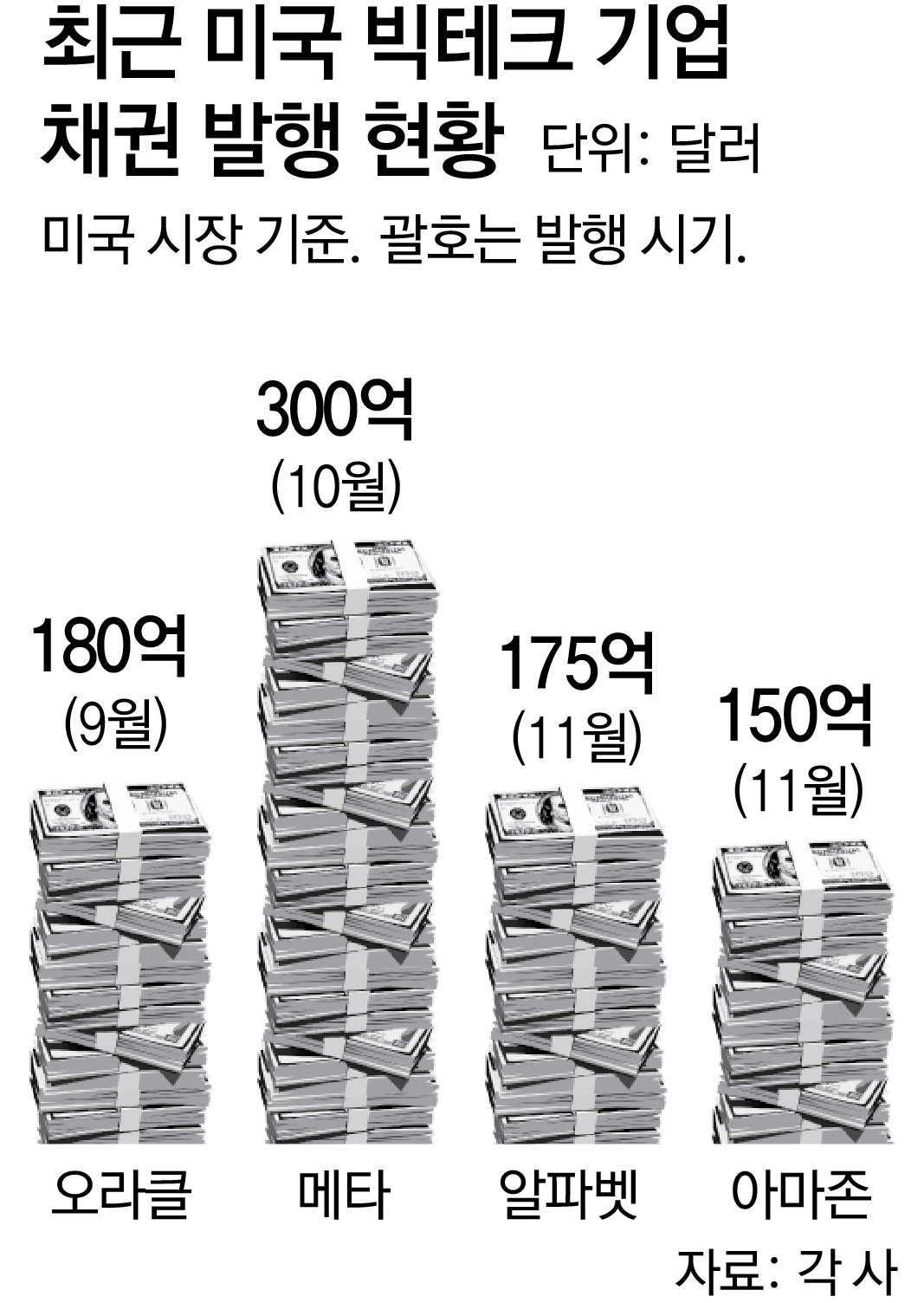 이런 와중에 우량 채권 발행이 늘자 비우량 회사채가 금리를 올리면서 시장 금리가 더 올라가고 있다. 인공지능(AI) 대규모 투자를 위해 아마존은 최근 150억 달러(약 22조215억 원) 규모의 회사채를 발행했다. 구글의 모기업인 알파벳도 이달 유럽 채권시장에서 64억 유로(약 10조8771억 원), 미국 달러채 시장에서 175억 달러(약 25조6917억 원) 규모의 회사채를 발행했다.