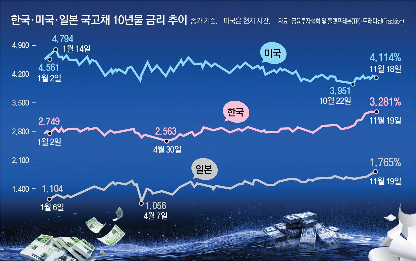 한국과 미국, 일본, 독일, 프랑스 등 주요국 국채 금리가 전방위적으로 오르고 있다. 일본 국채 10년물은 19일 17년 5개월 만에 최고치를 찍으며 중국 국채 금리와 역전될 가능성이 커졌다. 각국이 재정을 풀며 국고채 발행 물량이 늘고 있는 데다 기준금리 인하가 불확실해지며 기준금리를 기반으로 하는 국채 금리도 뛰고 있다.