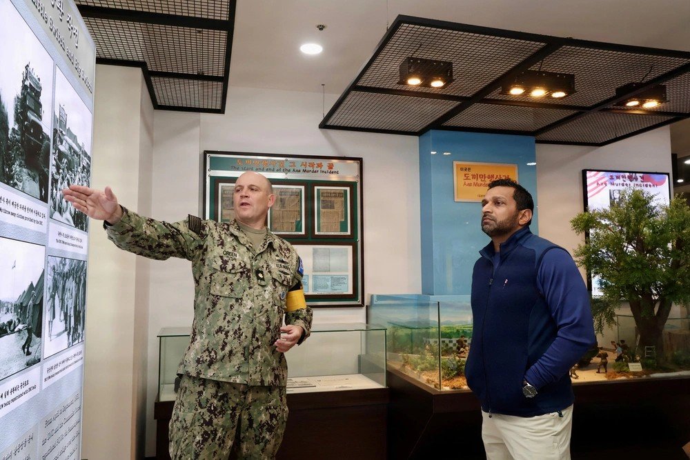 이달 7일 캐시 파텔 미국 연방수사국(FBI) 국장(오른쪽)이 공동경비구역(JSA) 안보 견학관에서 유엔사 군사정전위원회 합동임무 장교인 팀 크린 중령으로부터 현장 브리핑을 받고 있다. 파텔 국장 옆으로 판문점 도끼만행사건을 설명하는 전시 자료가 보인다. 파텔 국장은 트럼프 대통령의 4일 주간에 한국을 극비리에 방문해 경찰청 고위 관계자들과 사이버 범죄 및 스캠(사기)센터 척결 방안을 논의했고 이날 비무장지대(DMZ)를 찾아 안보 협력에 대한 의견을 나눴다 . 출처 미군영상정보배포서비스(DVIDS)