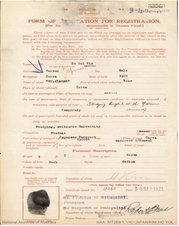호주 최초의 한인 유학생으로 알려진 김호열은 1921년 호주 장로교 선교사들의 초청을 받아 멜버른대에서 공부했다. 사진은 그의 외국인등록증신청서와 사진. 푸른숲 제공《우리에겐 아픈 역사인 강화도조약이 체결되던 1876년, 한 열일곱 살 조선 청년이 중국 상하이에서 호주행 배에 올랐다. 당시 호주는 골드러시로 금광 채굴 인력이 몰리던 시기. 그는 수많은 중국인들에 섞여 신세계로 갔다. 18년 뒤 1894년 시민권을 받으며 ‘존 코리아(John Corea)’라고 이름 지었다. 현재 기록상 확인되는 호주 최초의 한인 이민자다.》