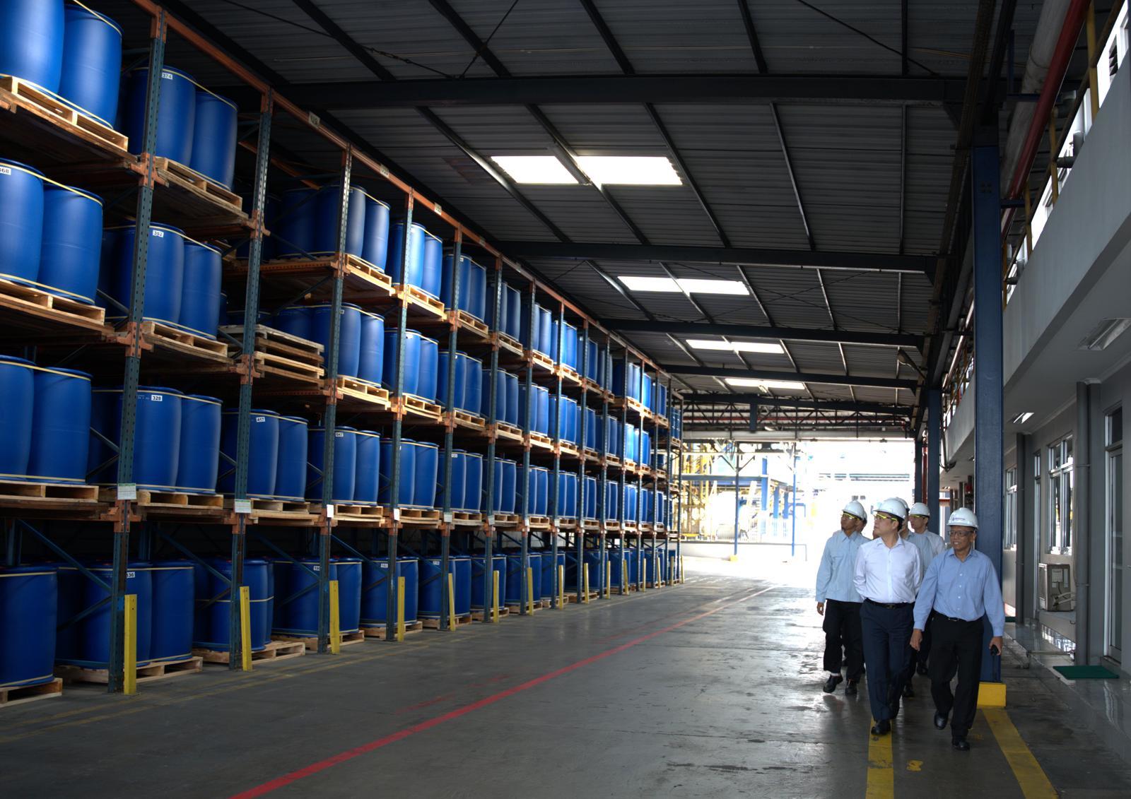 표경원 대표(왼쪽 두 번째)를 비롯한 애경케미칼 임직원들이 새롭게 인수한 에보닉 공장을 둘러보고 있다. 애경케미칼 제공