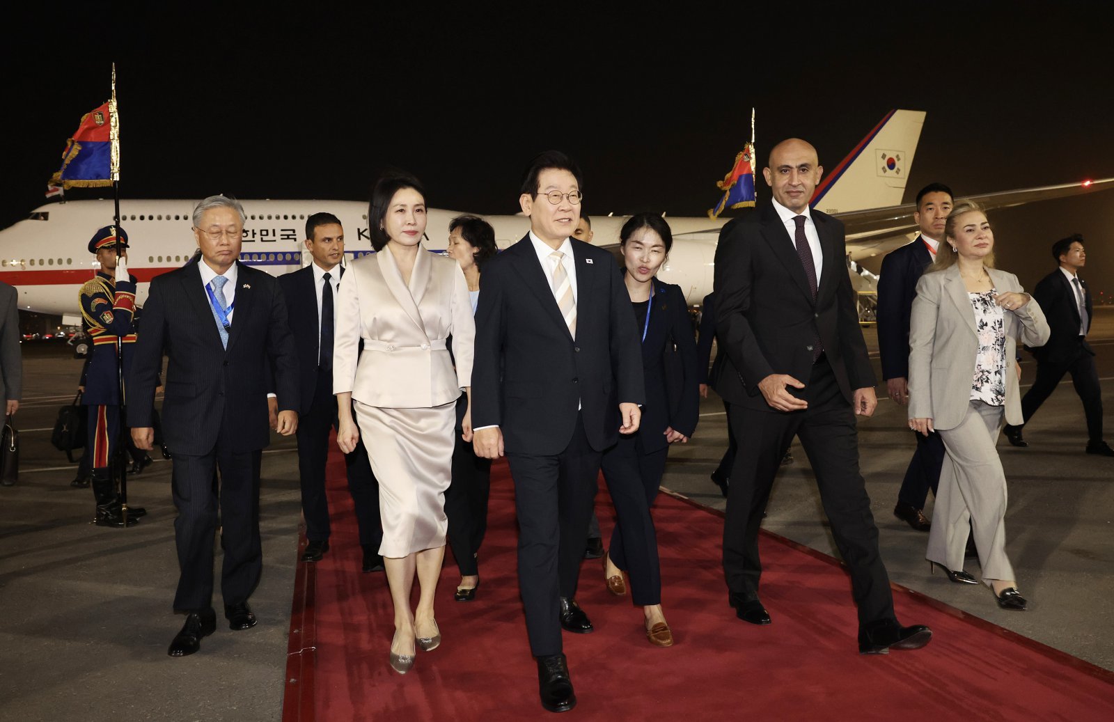 이집트를 공식 방문한 이재명 대통령과 김혜경 여사가 19일(현지 시간) 카이로 국제공항에서 이동하고 있다. 2025.11.20. [카이로=뉴시스]