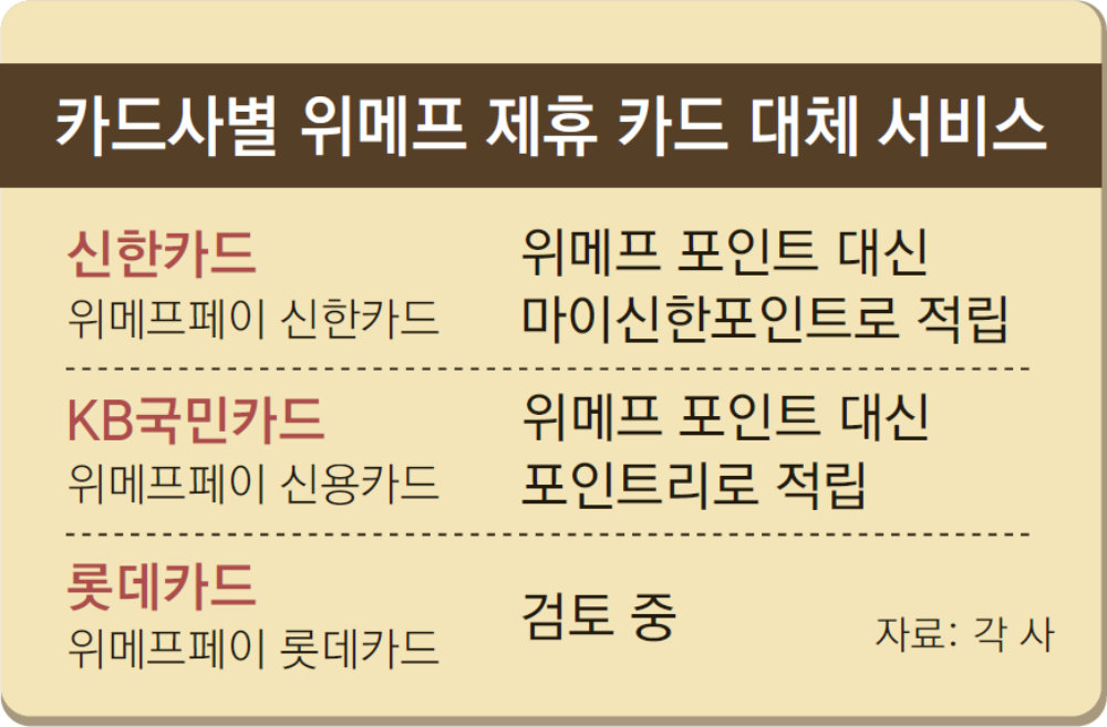 이에 따라 위메프 포인트를 쌓아주는 ‘전용 제휴카드’를 발급한 카드사들은 혜택 변경을 검토하거나 혜택을 아예 바꿨다. 롯데카드는 2024년 8월 위메프 롯데카드 발급을 중단했고, 위메프가 최근 파산하며 기존 보유 고객에게 위메프 포인트 대신 제공할 다른 수단을 찾고 있다. 위메프 전용 제휴카드를 둔 신한·KB국민카드는 자체 포인트인 신한마이포인트, 포인트리 등으로 바꿔 적립해 주고 있다.