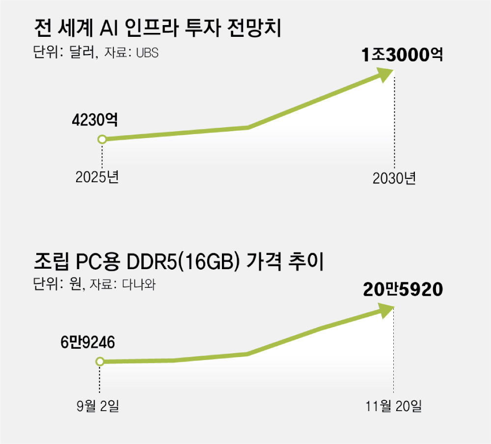 AI 인프라 투자가 급격히 확대되면서 그 부품 역할을 하는 반도체에 대한 수요도 급증하고 있다. 가격 비교 사이트 ‘다나와’에 따르면 이날 삼성전자 DDR5-5600 16GB 제품 가격은 20만5920원으로, 두 달여 전인 9월 2일(6만9246원)에 비해 3배 가까이로 올랐다. 한 업계 관계자는 “글로벌 빅테크들의 반도체 확보 경쟁 과열로 부르는 게 값인 상황”이라고 전했다.