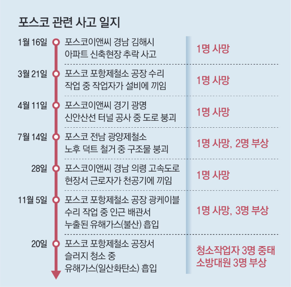 올해 포스코그룹 사업장 내 사망 사고는 끊이지 않고 있다. 1월 포스코이앤씨의 경남 김해시 아파트 신축 현장에서는 50대 근로자가 추락해 사망했다. 3월에는 포항제철소에서 수리 작업을 하던 작업자 1명이 설비에 끼여 숨졌다. 이후 4월부터 7월까지 포스코이앤씨의 도로 공사 현장과 광양제철소 등에서 3건의 붕괴 등 안전사고가 발생해 근로자 3명이 목숨을 잃었다. 사고가 반복되자 이재명 대통령은 7월 29일 국무회의에서 “반복적인 사고는 죽음을 용인하는 것이다. 미필적 고의에 의한 살인이 아니냐”며 강하게 질타했다.