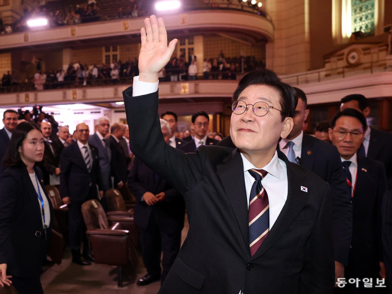 이재명 대통령이 20일(현지시간) 이집트 카이로 대학에서 연설을 마친 뒤 손을 들어 인사를 하고 있다. 카이로=송은석 기자 silverstone@donga.com