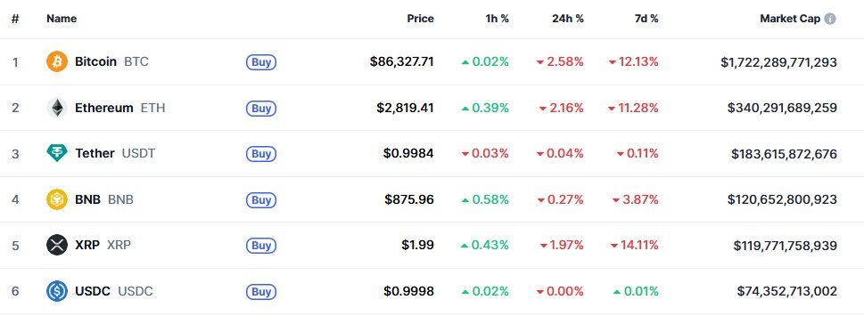 21일 오전 5시 20분 현재 글로벌 코인 시황 중계사이트 코인마켓캡에서 비트코인은 24시간 전보다 2.58% 하락한 8만6327달러를 기록하고 있다. 앞서 비트코인은 8만6040달러까지 떨어져 8만6000선이 붕괴할 뻔했다.