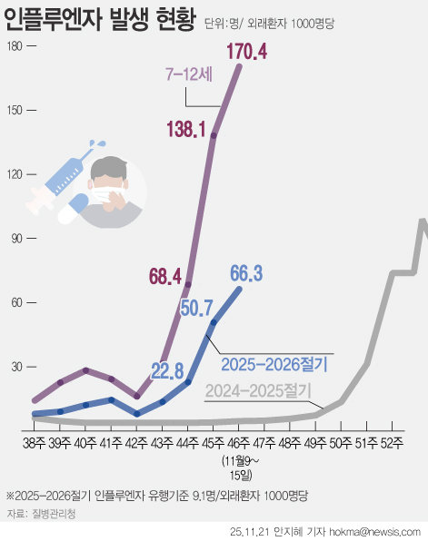 이번 25-26절기 독감 유행은 예년에 비해 이른 시기부터 확산하고 있다. 이번 절기 유행주의보는 작년보다 약 두 달 빠른 지난달 17일 유행 기준 9.1명을 넘으며 발령됐는데, 이후 환자 발생 규모가 42주차 7.9명, 43주차 13.6명, 33주차 22.8명, 45주차 50.7명 등으로 계속 커지고 있다.
