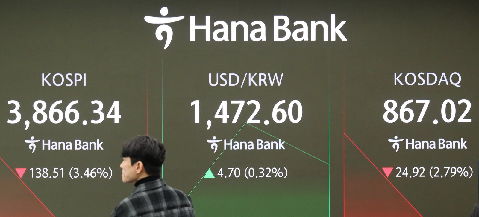 코스피가 전 거래일(4004.85)보다 96.15.포인트(2.40%) 하락한 3908.70에 개장한 21일 오전 서울 중구 하나은행 딜링룸 전광판에 지수가 표시 되고 있다. 코스닥 지수는 전 거래일(891.94)보다 24.49포인트(2.75%) 내린 867.45에 거래를 시작했다. 원·달러 환율은 전 거래일 주간거래 종가(1467.9원)보다 4.5원 오른 1472.4원에 출발했다.2025.11.21. [서울=뉴시스]