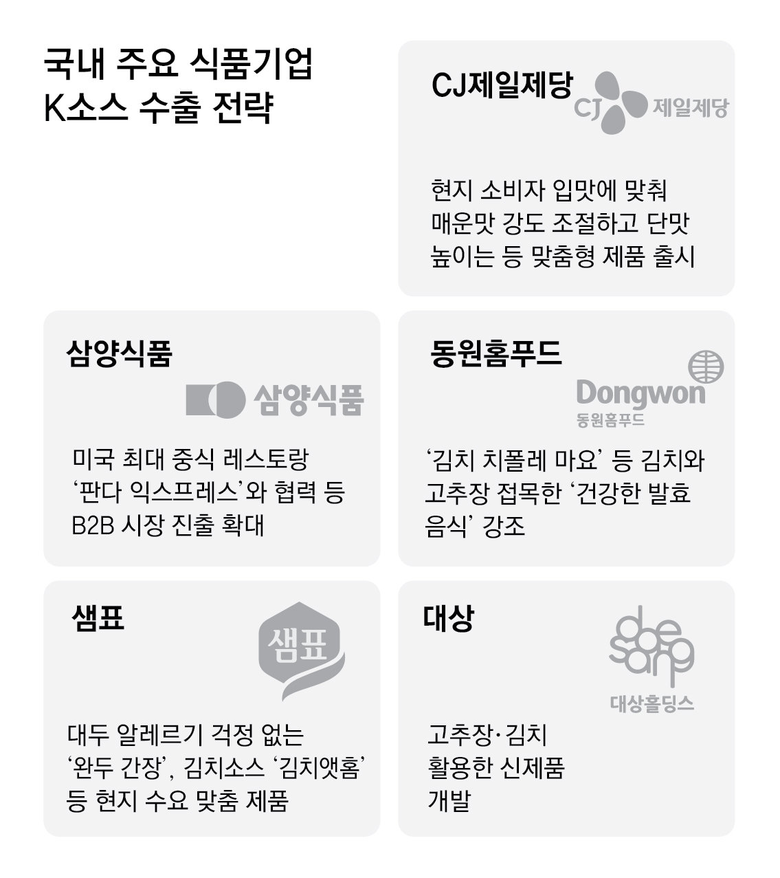 CJ제일제당은 전통장·고기양념장·떡볶이·치킨소스 등 K소스 라인업을 60여 개국에 판매하고 있다. 고추장은 해외 소비자가 보다 쉽게 먹을 수 있도록 매운맛의 강도를 조절했다. 미국에서는 디핑소스나 드리즐에 익숙한 현지 식문화를 반영해 튜브형 고추장, K바비큐 드리즐 등으로 내놨다. 중국에서 판매하는 고기양념장은 한국식 맛은 유지하면서 현지 소비자가 선호하는 쯔란, 흑후추 등을 첨가하고, 고기를 재는 용도가 아닌 ‘볶음용 소스’를 출시했다. 일본에서는 일본인이 좋아하는 한식 메뉴인 닭갈비 양념을 선보이고, 야키니쿠 식문화에 맞춰 ‘바르는 소스’로 선보였다.