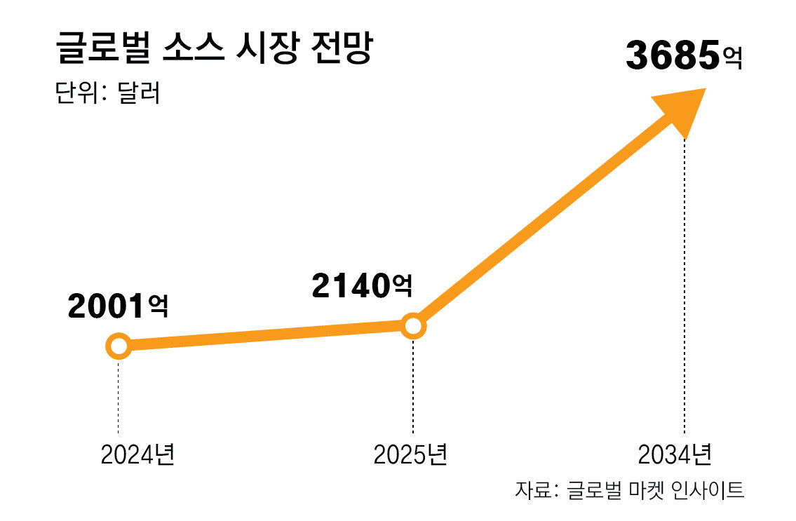 글로벌 소스 시장이 성장세를 타면서 K소스에 대한 수요도 꾸준히 늘어날 것으로 전망된다. 시장조사업체 글로벌 마켓 인사이트(GMI)에 따르면 전 세계 소스·조미료 시장 규모는 2024년 2001억 달러(약 294조 원)에서 2025년 2140억 달러로 확대될 것으로 예상된다. 장기적으로는 2034년 3685억 달러에 이를 것으로 전망돼 연평균 6% 안팎으로 성장할 것으로 보인다.