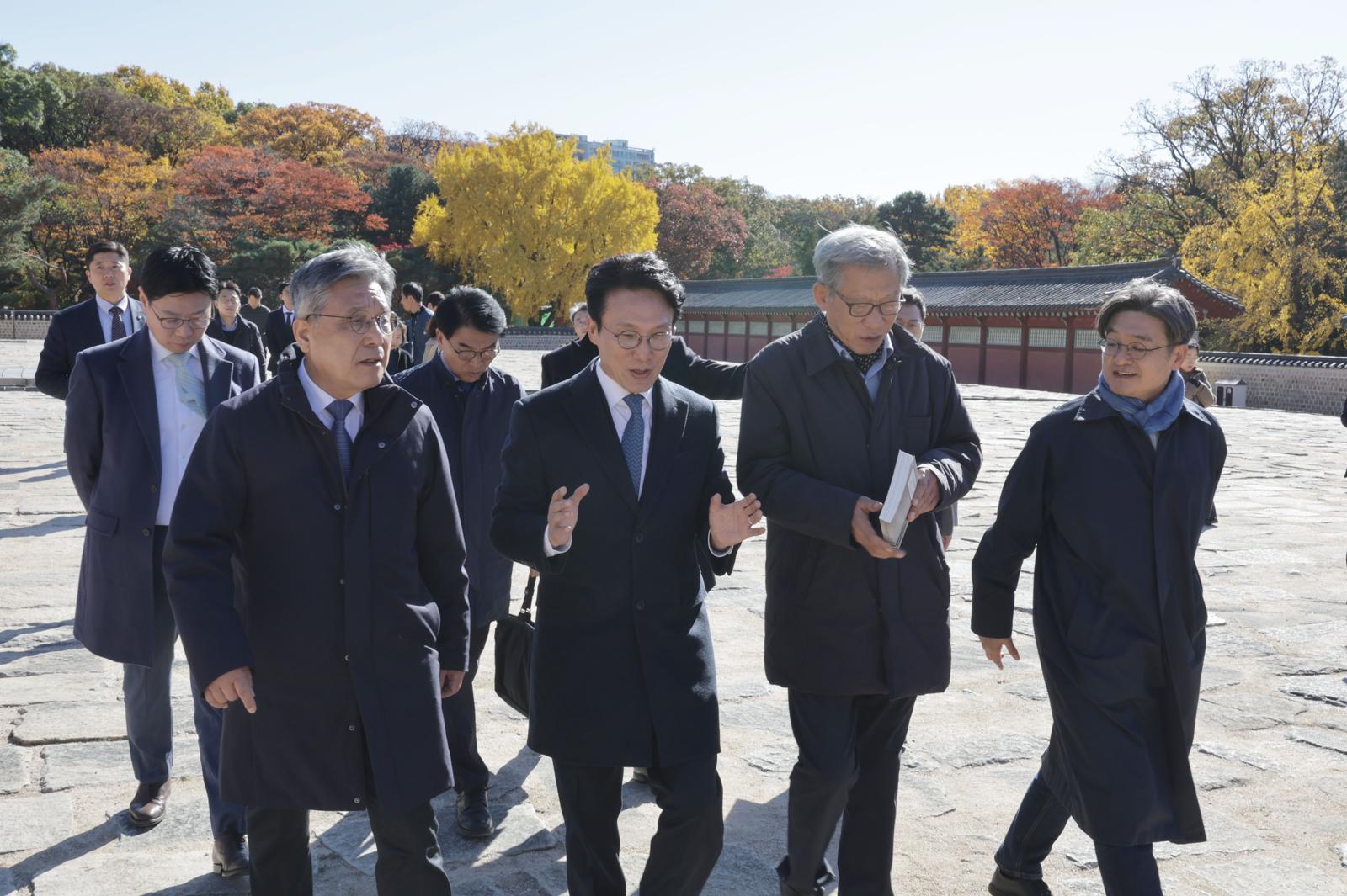 김민석 국무총리가 10일 서울 종로구 유네스코 세계문화유산인 종묘를 찾아 최근 서울시의 세운 4지구 재개발 계획에 대한 정부 입장을 표명하고 있다. 이날 종묘 방문에는 허민 국가유산청장(앞 줄 왼족), 유홍준 국립박물관장 등이 함께 했다. 사진 속 긴 건물 뒤쪽 방향이 문제의 세운4지구. 변영욱 기자 cut@donga.com