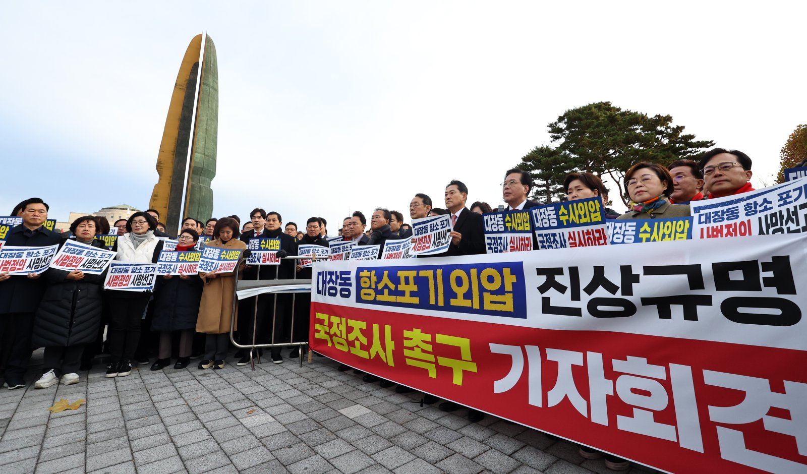 국민의힘은 지난 추석 연휴 직전 대구와 서울에서 장외투쟁을 벌였고, 지난 12일에는 국회 본관 앞에서 ‘대장동 일당 7400억 국고 환수 촉구 및 검찰 항소 포기 외압 규탄대회’를 진행하기도 했다.
