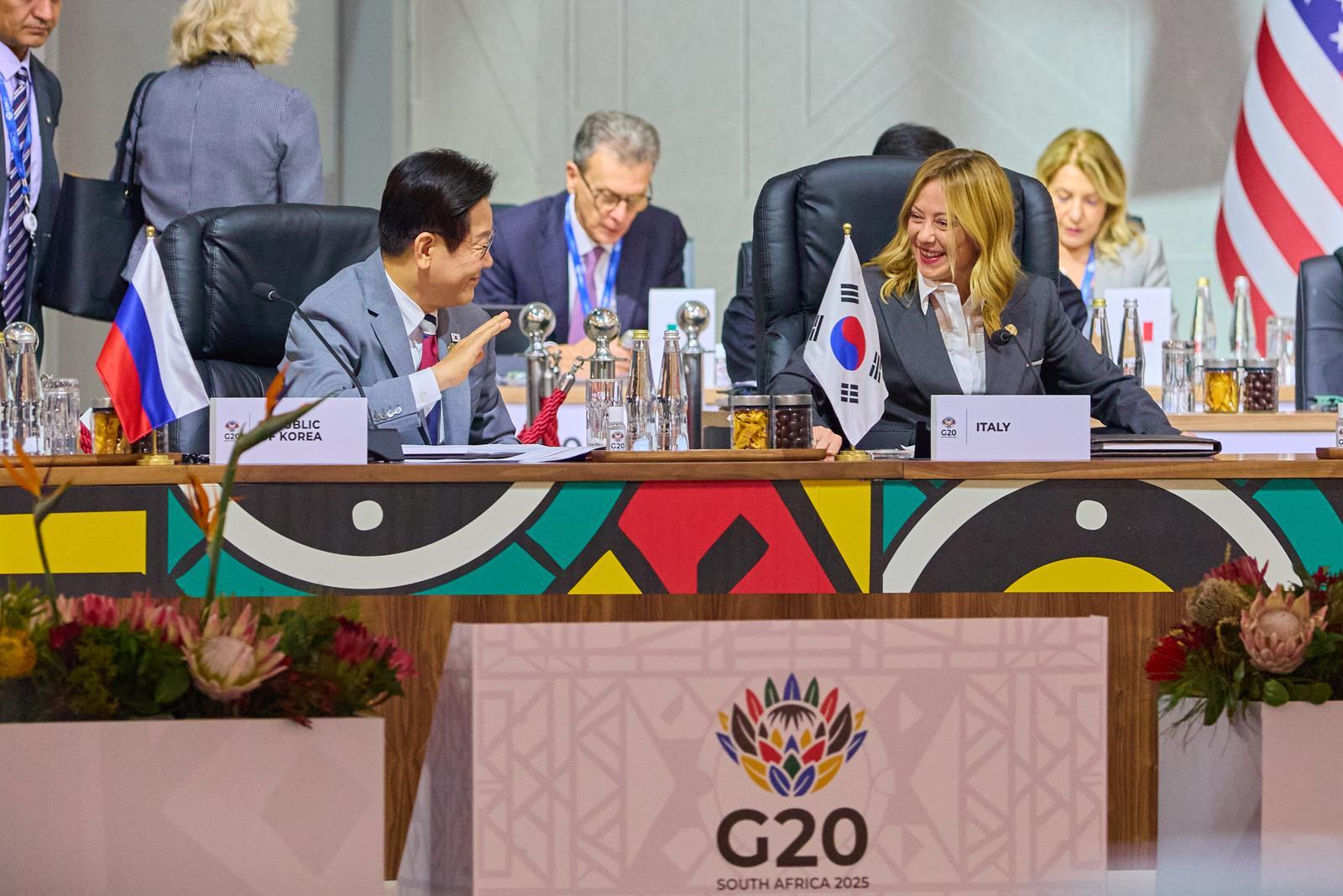 이재명 대통령이 22일(현지시간) 남아프리카공화국 나스렉 엑스포센터에서 열린 주요 20개국(G20) 정상회의에서 멜로니 이탈리아 총리와 인사하고 있다. 20251122 대통령실사진기자단