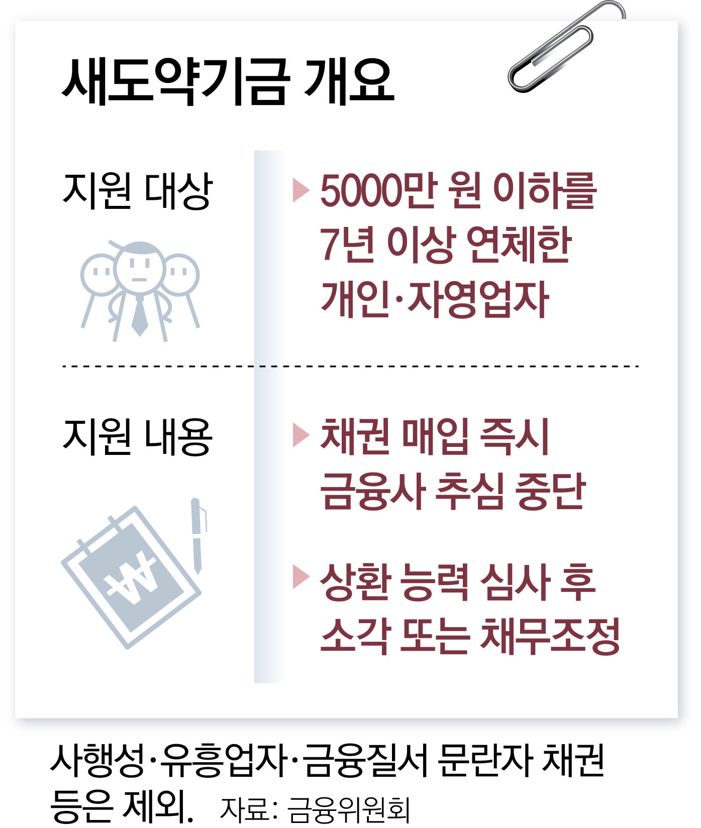 이재명 정부가 장기 연체자 빚 탕감을 위해 마련한 배드뱅크인 ‘새도약기금’에서 5대 시중은행(KB국민·신한·하나·우리·NH농협)의 부담 비율이 70%에 가까운 것으로 집계됐다. 새도약기금이 사들일 채권을 절반 이상 보유한 대부업체들은 오히려 미온적인 분위기다. 이들은 부정적 이미지가 강한 ‘대부’ 명칭을 ‘채권관리’ 등으로 변경해 달라는 등 여러 요구를 하며 기금 분담을 두고 당국과 팽팽한 힘 겨루기를 하는 분위기다.