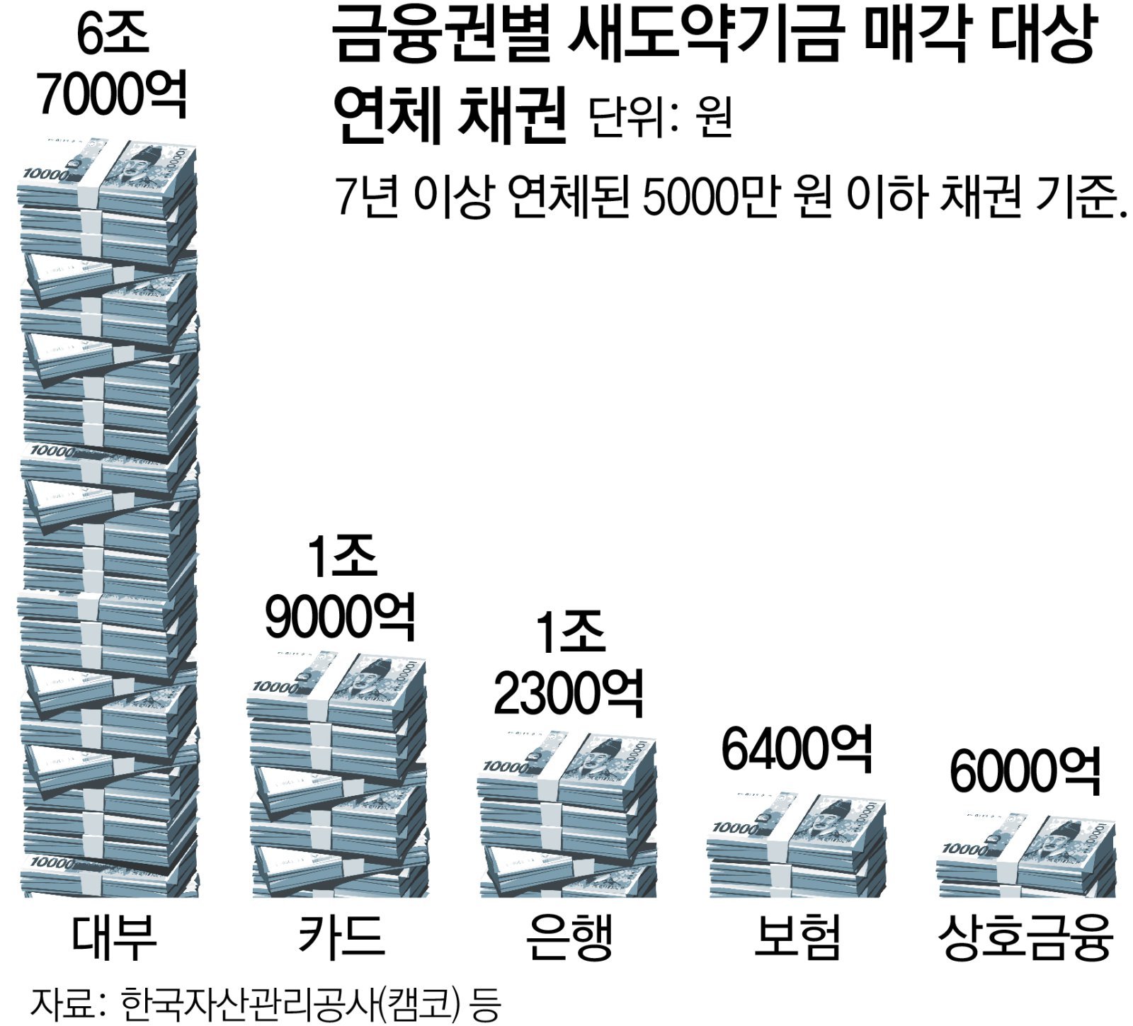 한국자산관리공사(캠코) 등에 따르면 대부업권이 보유한 새도약기금의 매입 채권(7년 이상, 5000만 원 이하)은 전체 매입 채권의 절반이 넘는 약 6조7000억 원이다. ‘대부업체의 채권 매각 없이는 배드뱅크가 반쪽짜리에 불과하다’는 이야기가 나오는 이유다.