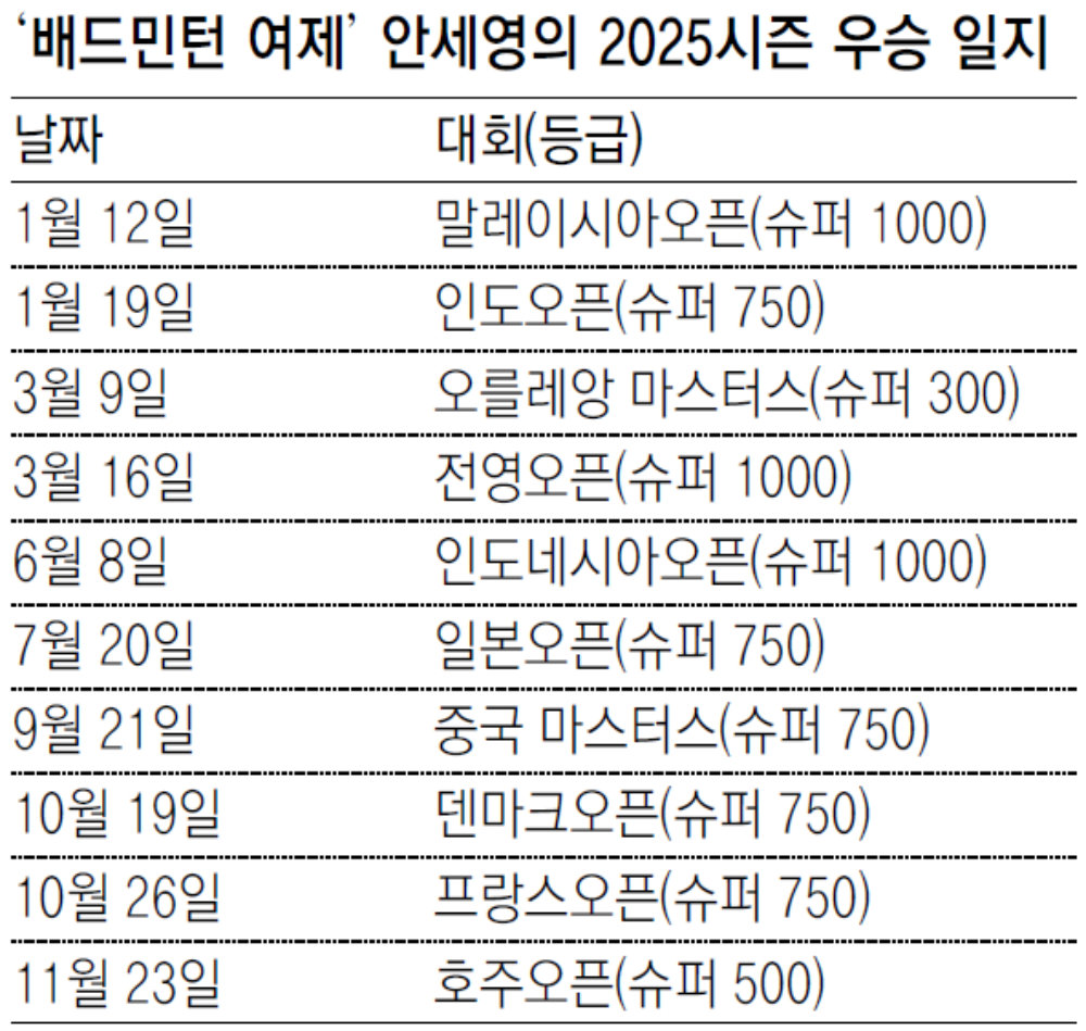 이날 사상 첫 한 시즌 10승 달성으로 당시의 아쉬움을 털어버린 안세영은 남은 시즌 더 큰 역사에 도전한다. 안세영은 다음 달 중국에서 열리는 BWF 월드투어 파이널스에서 11번째 우승에 도전한다. 안세영이 우승으로 피날레를 장식하면 2019년 남자 단식 11회 우승을 차지한 모모타 겐토(31·일본·은퇴)와 나란히 한 시즌 최다우승 타이기록을 쓰게 된다.