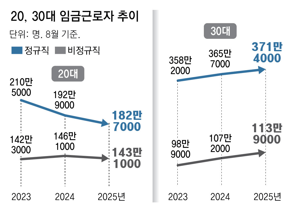 2030대 정규직은 2015년 8월 612만8000명에서 올해 8월 554만1000명으로 58만7000명 줄어든 반면에 같은 기간 비정규직은 44만5000명 늘었다. 특히 2030대 비정규직 중에서도 기간제 근로자는 104만8000명에서 159만 명으로 약 54만2000명 급증했다.