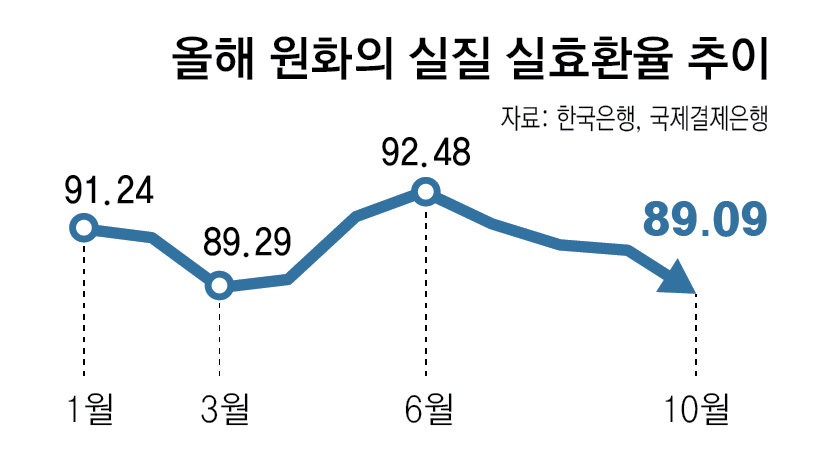 BIS가 통계를 발표하는 주요 교역국 64개국 가운데 한국보다 지난달 실질 실효환율이 낮은 곳은 일본(70.41)과 중국(87.94)뿐이었다. 중국은 올해 4월부터 86∼87 선을 오갔으나, 일본은 4월 75.8이었던 실질 실효환율이 이달 급격하게 하락했다. 다카이치 사나에(高市早苗) 일본 총리의 확장 재정 기조로 엔화가 약세 흐름을 보인 영향이다.