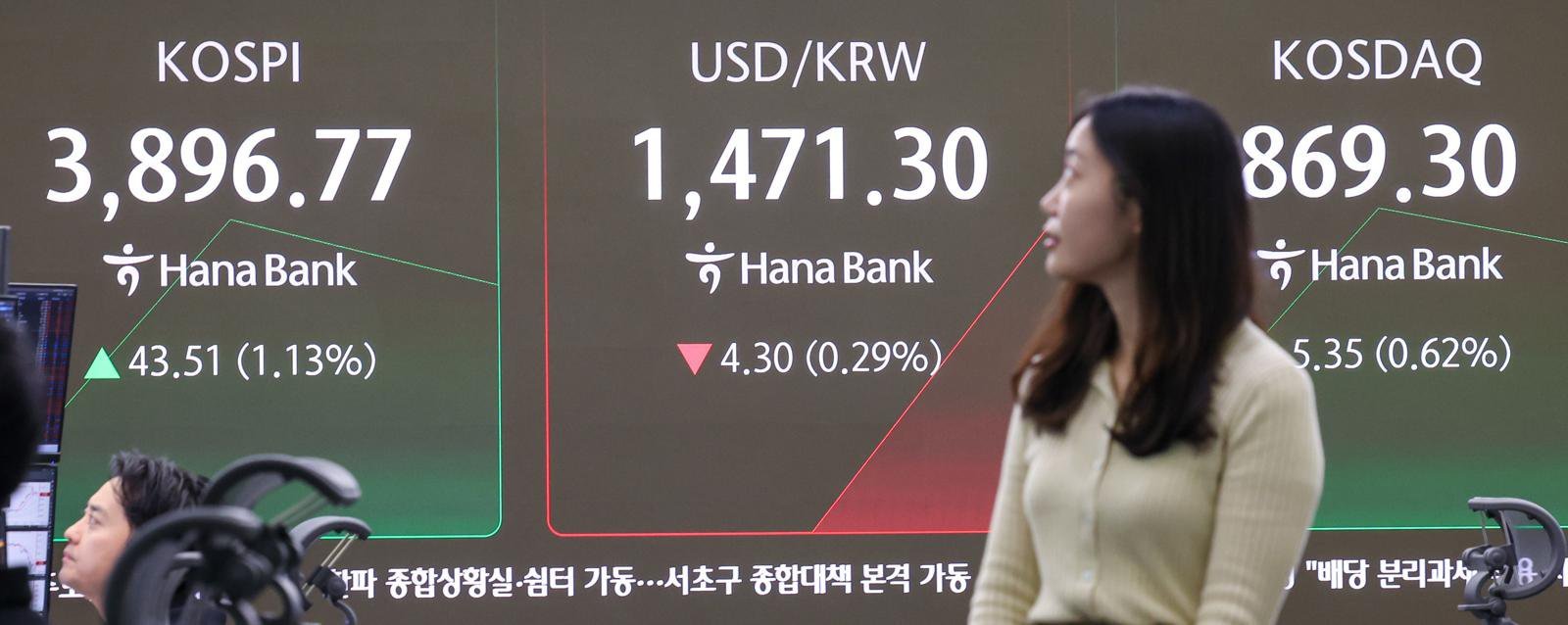 24일 오전 서울 중구 하나은행 본점 딜링룸 전광판에 코스피, 코스닥 지수와 달러·원 환율 개장 후 시황이 나오고 있다. 2025.11.24/뉴스1