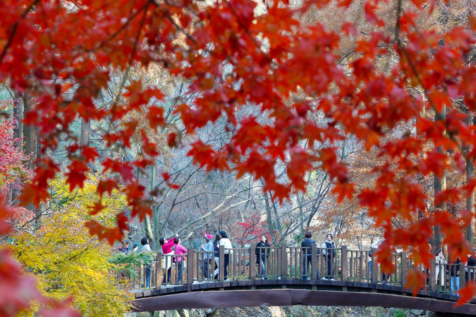 22일 오후 대전 서구 장태산자연휴양림을 찾은 나들이객들이 깊어가는 가을의 정취를 즐기고 있다. 2025.11.22/뉴스1 ⓒ News1