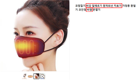이번 조사로 온라인을 통해 감기약, 비염약, 점안액 등 판매를 알선한 광고 업체가 적발됐다. 의약외품의 경우 보건용마스크(KF80)를 KF94 마스크의 효과인 ‘바이러스, 감염원 차단’ 등으로 광고하거나 콘택트렌즈관리용품을 ‘인공눈물, 시력보호안약’ 등으로 광고한 경우도 있었다. 불법 해외 의료기기 구매 대행 광고나, 공산품인데도 의료기기의 효과가 있는 것으로 잘못 인식될 우려가 있는 광고 등이 적발됐다. 온라인 플랫폼에서는 일반 공산품을 ‘비염치료기 코골이방지 패치 발열 콧물 코막힘 감기’라는 키워드로 광고해 판매하기도 했다.