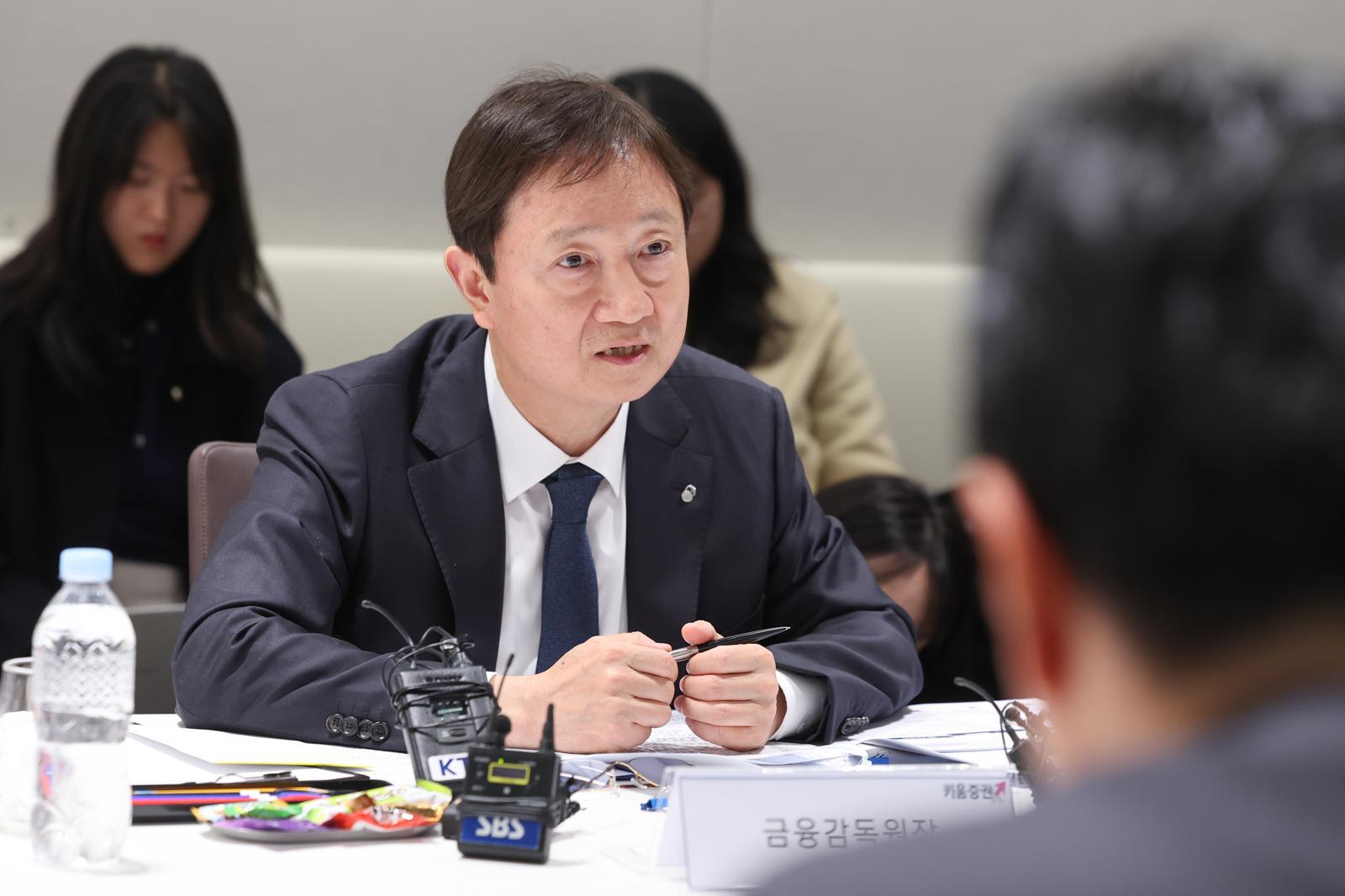 이찬진 금융감독원장이 24일 오후 증권사 영업점 현장방문차 서울 영등포구 키움증권 본사를 찾아 엄주성 대표이사 등 임원들과 간담회를 하고 있다. 2025.11.24/뉴스1