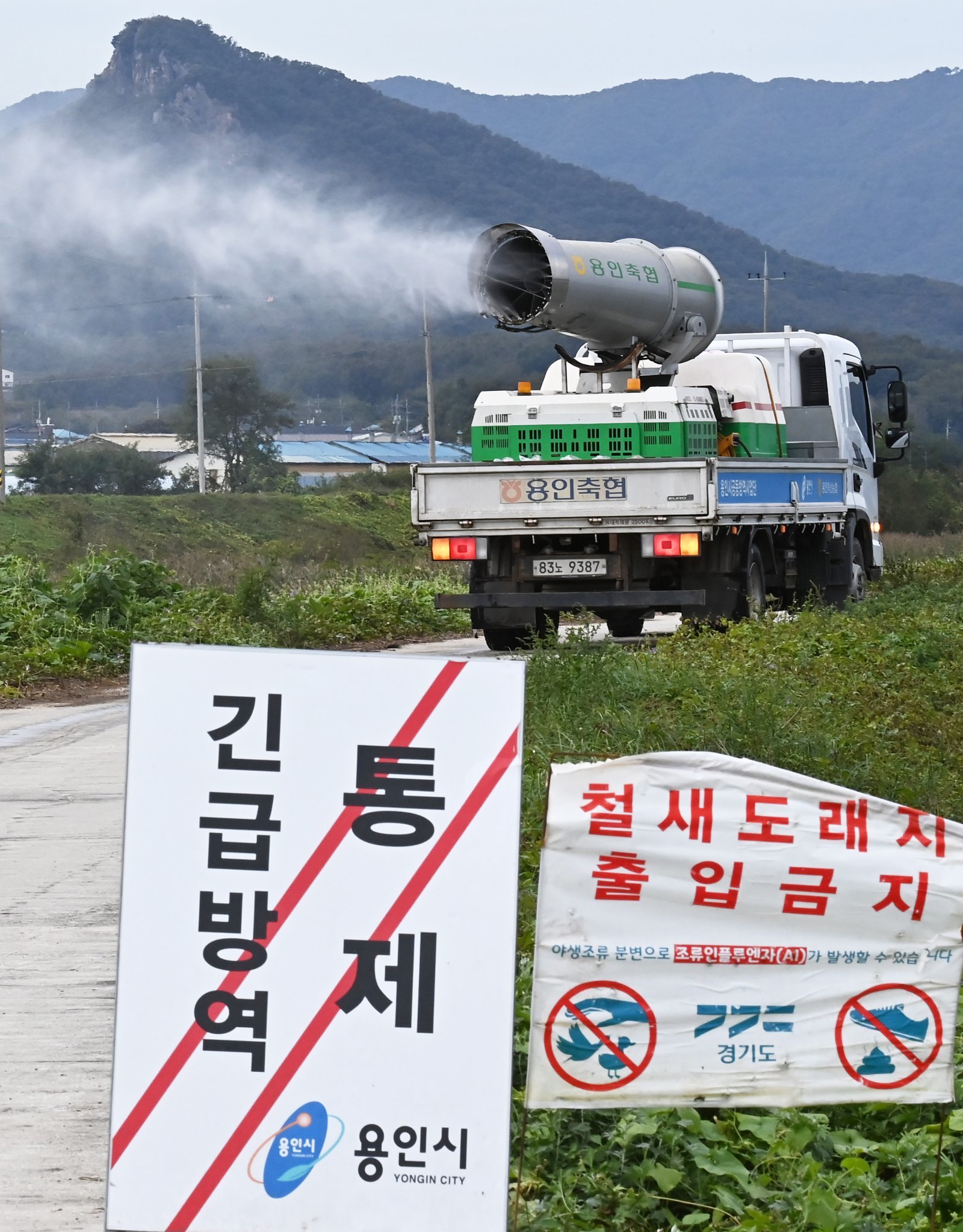 21일 경기도 용인시 백암면 청미천 일대에서 방역차량이 방역작업을 하고 있다. 최근 용인에서 포획된 야생조류에서 H5N1형 고병원성 조류인플루엔자(AI) 바이러스가 검출되자 방역당국은 위기 단계를 ‘심각’ 단계로 상향 조정하고 강화된 방역을 실시하고 있다. 2024.10.21 뉴시스