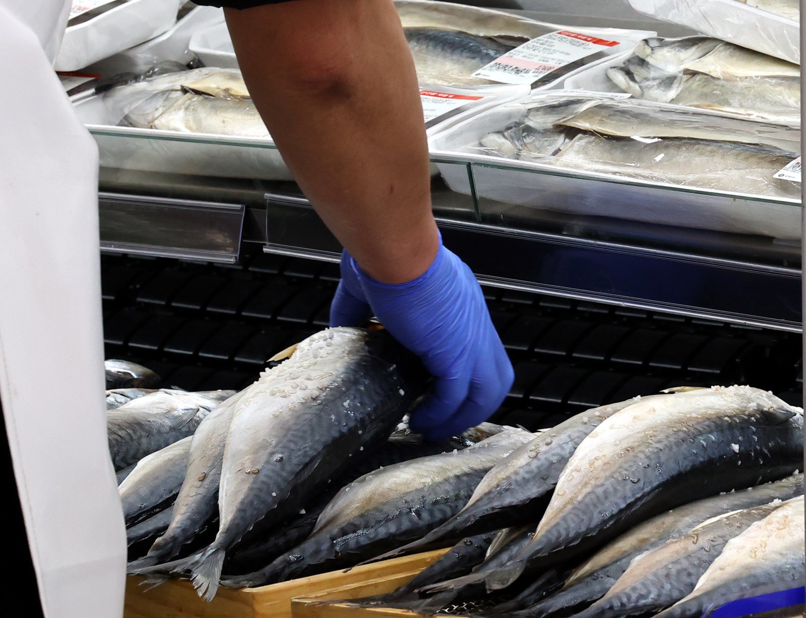 24일 오전 서울의 한 대형마트에서 직원이 고등어를 진열하고 있다. 한국해양수산개발원에 따르면 지난달 고등어 생산량은 전월 대비 72.5% 급감한 5,608톤으로 집계되었다. 이는 평년 대비도 38.1% 줄어든 수치로, 조업 일수 감소와 기상 악화가 주요 원인으로 지목되었다. 산지 가격은 고등어 ㎏당 5,937원(전월比 +28.4%), 갈치는 ㎏당 2만4,200원(전월比 +32.7%)으로 상승했다. 2025.03.24. [서울=뉴시스]