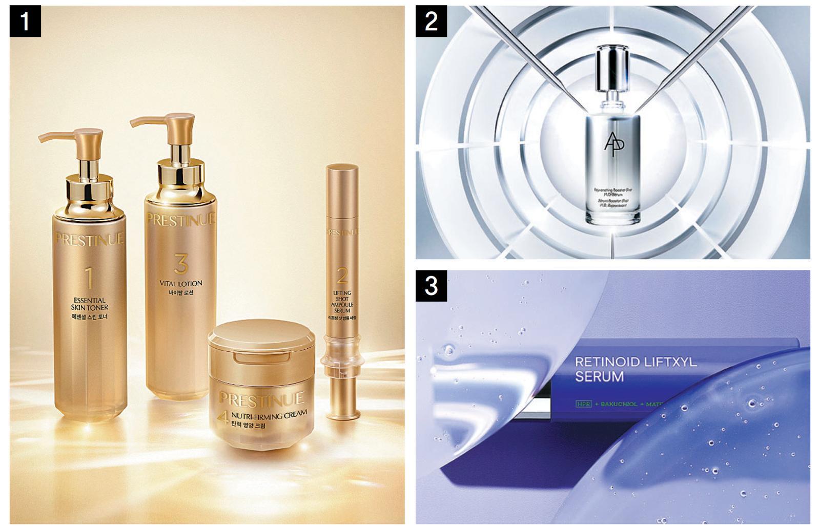 국내 화장품 업체들이 선보인 노화 관리 제품들. ① LG생활건강의 인상 안티에이징 브랜드 ‘프레스티뉴’. ② 아모레퍼시픽의 에이피 뷰티 ‘리쥬브네이팅 부스터 샷 M.D. 세럼’. ③ 삼양사 더마 바이오 코스메틱 브랜드 메디앤서의 ‘레티노이드 리프트실 세럼’. 각 사 제공