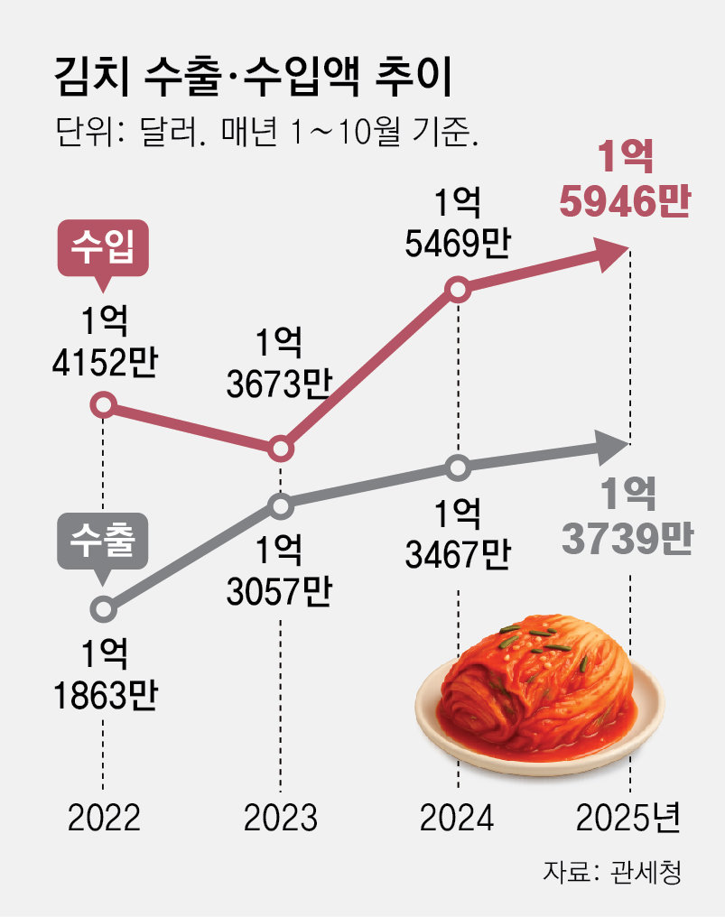 김치 수출이 호조세지만 오히려 무역수지는 적자를 보이고 있다. 지난달까지 김치 수입액은 1년 전과 비교해 3.1% 늘어난 1억5946만 달러(약 2260억 원)로 집계됐다. 수입액이 더 큰 폭으로 늘어나면서 무역 수지는 2207만 달러 적자를 보였다. 전년 동기(2001만 달러) 대비 적자 폭이 10.3% 확대됐다. 김치 무역수지는 2022년부터 3년째 적자를 보고 있는데, 올해는 그 폭이 더욱 커질 가능성이 높다.