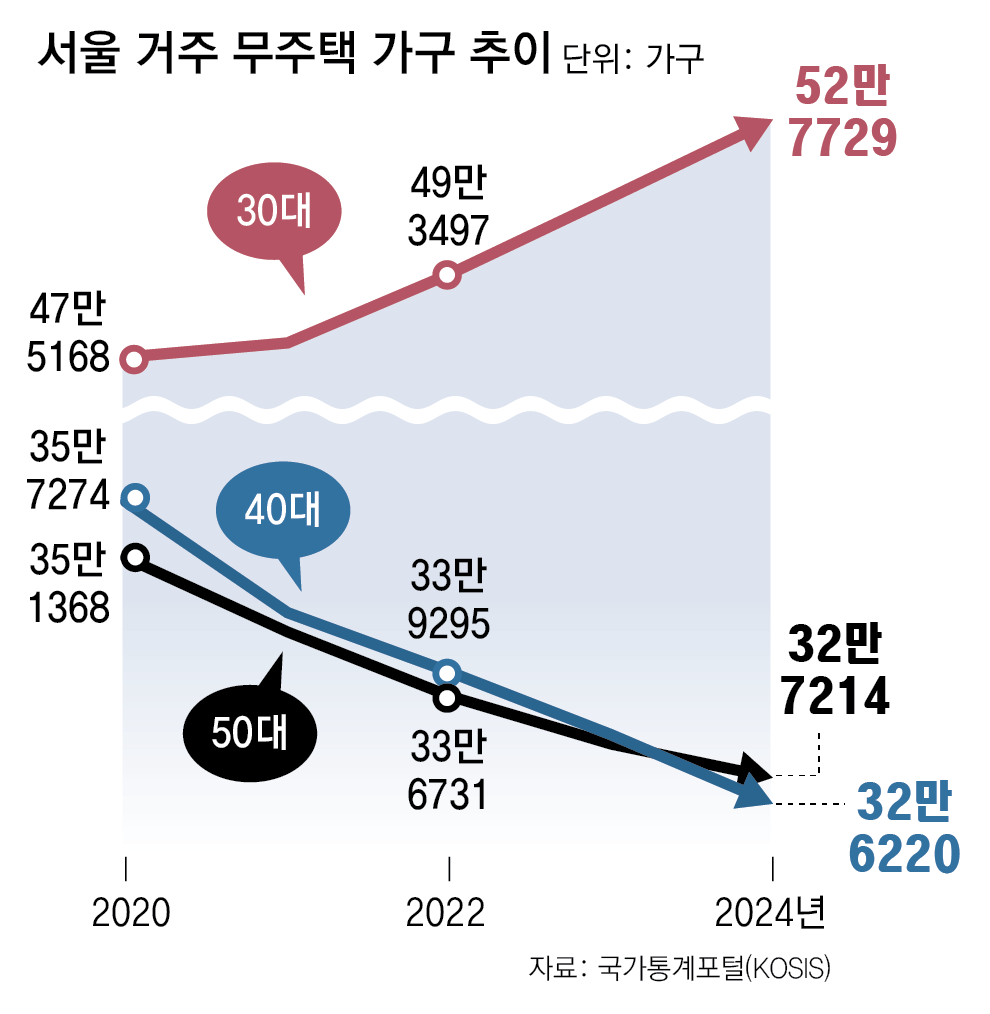 서울 거주 30대 무주택 가구는 2018년(45만6461가구) 이후 6년 연속 늘고 있다. 서울에 사는 40대와 50대 무주택 가구 수가 2015년 각각 41만837가구, 36만5961가구에서 지난해 32만6220가구, 32만7214가구로 통계 작성 이후 매년 줄고 있는 것과는 상반된 모습이다.