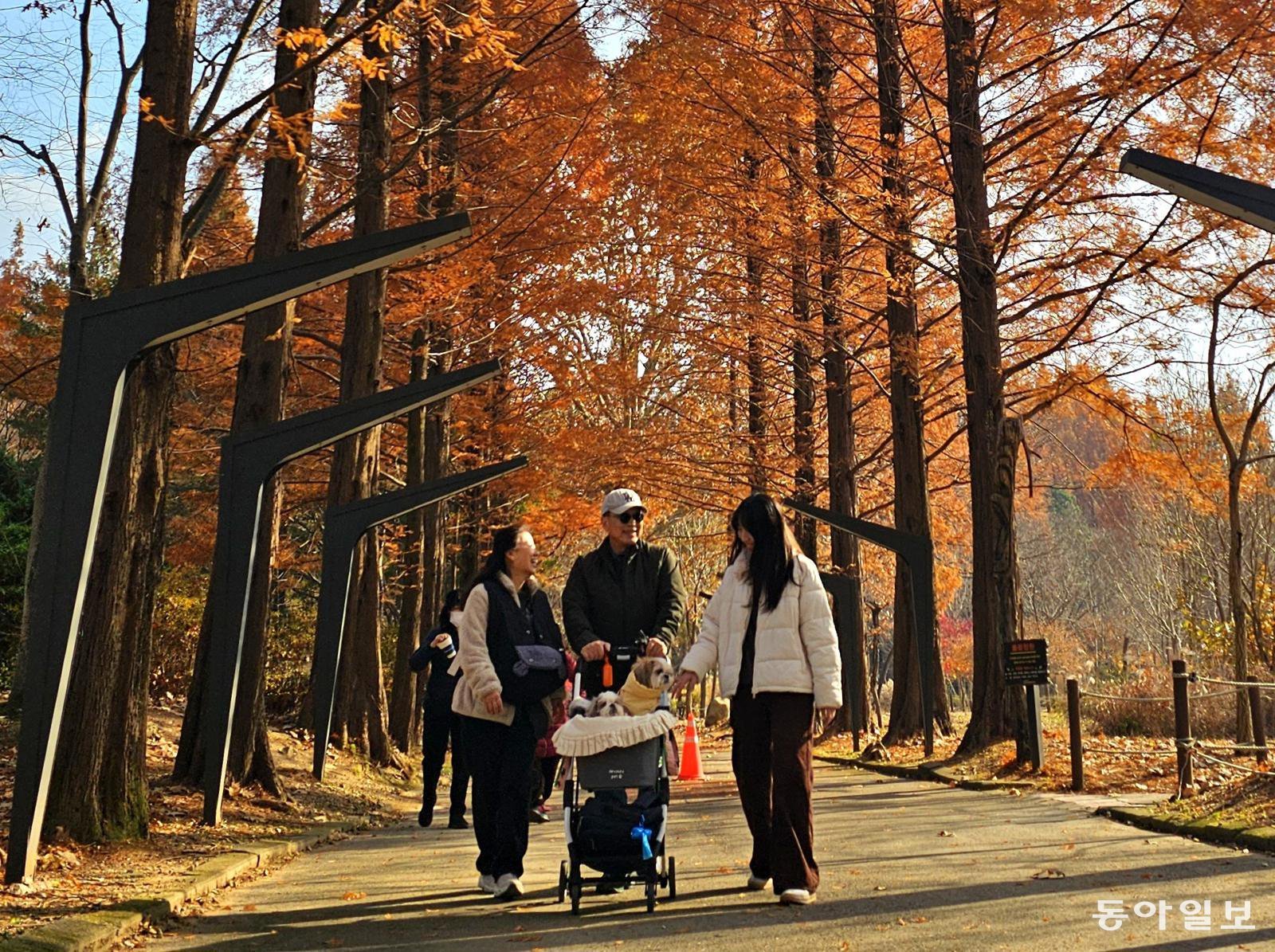 22일 인천 남동구 장수동 인천대공원을 찾은 시민들이 메타세쿼이아 길을 걸으며 늦가을의 정취를 만끽하고 있다. 메타세쿼이아 길은 인천대공원 정문 주차장 인근, 어울마당 둘레, 백범광장 인근에 조성돼 있다.