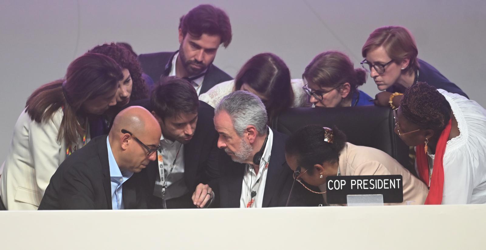 22일(현지 시간) 브라질 벨렝에서 열린 제30차 유엔 기후변화협약 당사국총회(COP30)에서 안드레 두라구 COP30 의장(가운데)과 사이먼 스틸 유엔 기후변화협약(UNFCCC) 사무총장(앞줄 왼쪽) 등이 심각한 표정으로 의견을 나누고 있다. 벨렝=신화 뉴시스