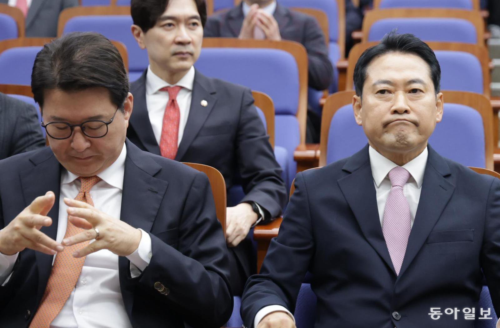 국민의힘 장동혁 대표(오른쪽)가 24일 서울 여의도 국회에서 열린 의원총회에 참석해 송언석 원내대표의 발언을 듣고 있다. 박형기 기자 oneshot@donga.com