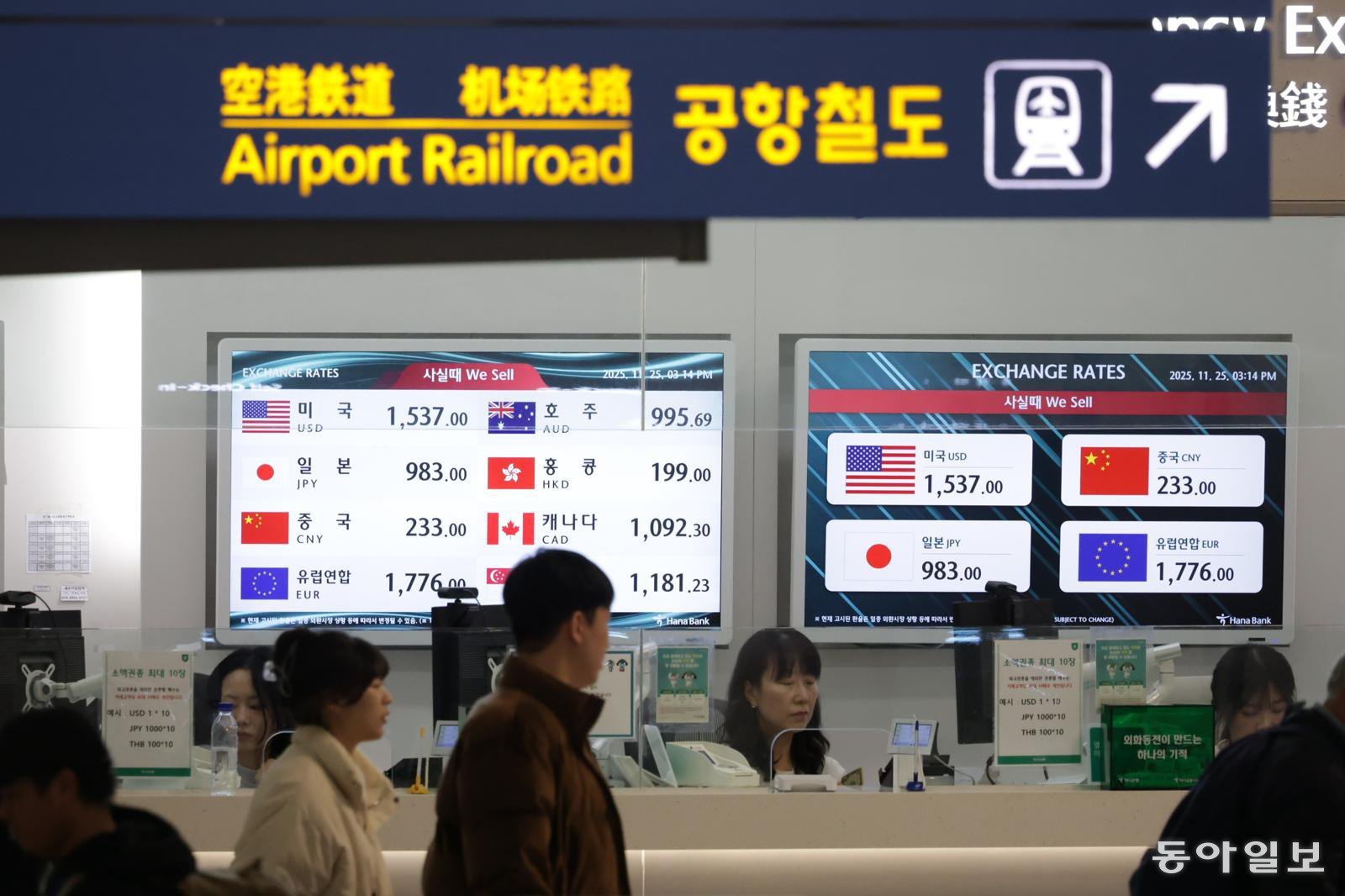 25일 금융권에 따르면 인천공항에 환전소를 보유한 KB국민·우리·하나은행의 이날 인천공항 환율은 평균 1536원으로 집계됐다. 은행의 인천공항 출장소는 연중무휴(365일) 환전 영업을 하는 특수성 때문에 일반 영업점보다 높은 환율(매매 기준율 대비 4.2% 부가)을 적용한다.