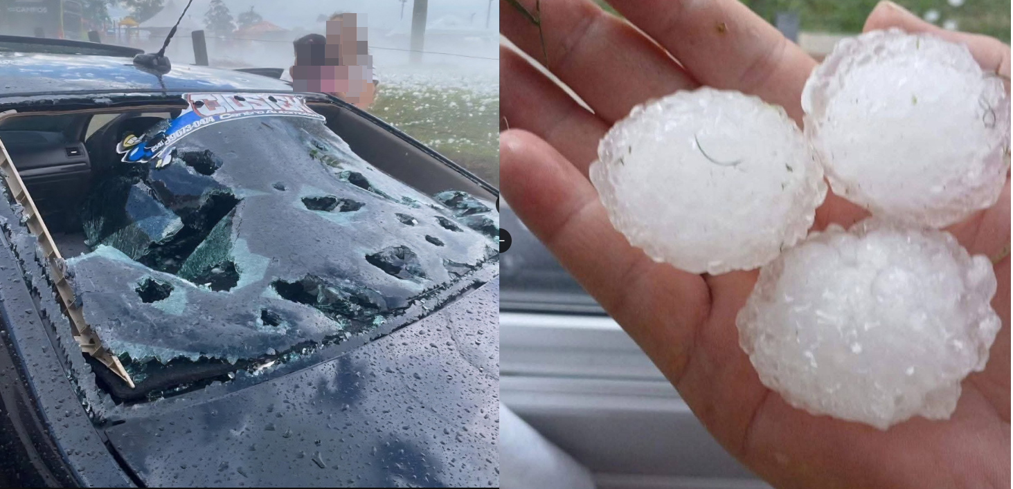 브라질 에레싱에 떨어진 초대형 우박. 우박 충격으로 차량 유리가 산산조각 났고, 손바닥만 한 ‘야구공 크기’ 우박을 찍은 사진이 SNS에 잇따라 올라왔다. X 갈무리