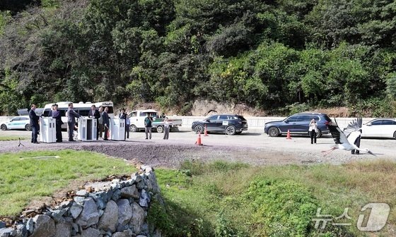 지난달 15일 김해시 진영읍에서 열린 김해 화포천 습지 과학관 개관식에서 행사 관계자들이 황사를 방사하고 있다.(김해시 제공)