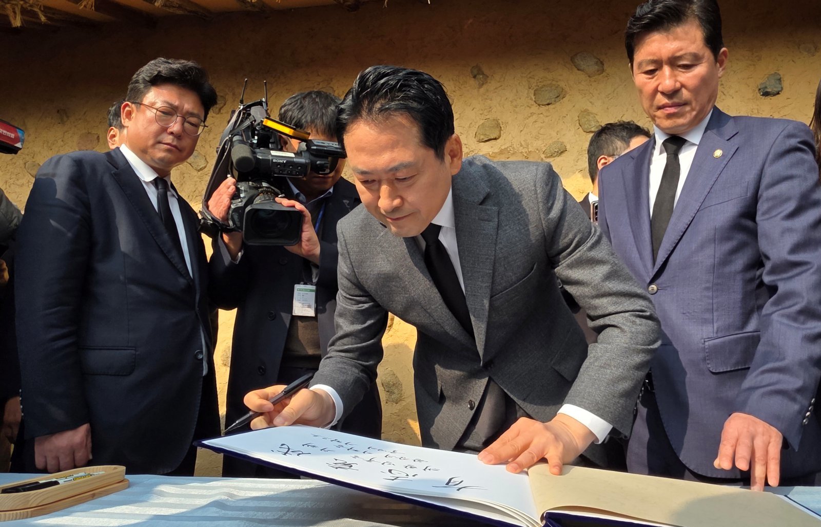 장동혁 국민의힘 대표가 25일 당 대표 취임 이후 처음으로 경북 구미 박정희 전 대통령 생가를 찾아 헌화를 마친 뒤 기념사진을 찍고 있다. 장 대표는 “한강의 기적을 이룬 힘으로 이제 국민이 대한민국을 위해서 국민의 기적을 이룰 때"라고 했다. 2025.11.25/뉴스1