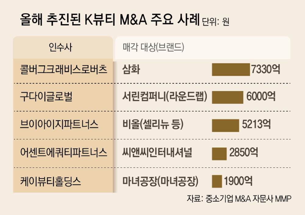 브랜드와 유통 플랫폼을 결합한 투자 흐름도 뚜렷했다. 기초화장품 브랜드 ‘라운드랩’을 보유한 서린컴퍼니가 구다이글로벌에 6000억 원에 매각됐다. 구다이글로벌은 ‘조선미녀’를 비롯해 ‘티르티르’ 등 K뷰티 대표 인디브랜드를 잇달아 인수하며 글로벌 유통 포트폴리오를 빠르게 구축한 곳이다. 인수된 브랜드들의 해외 매출 비중은 60% 이상이다. 케이뷰티홀딩스의 마녀공장(1900억 원) 인수도 주목받았다. 마녀공장은 미국 아마존 스킨케어 부문에서 판매 상위권을 유지하고 있다.